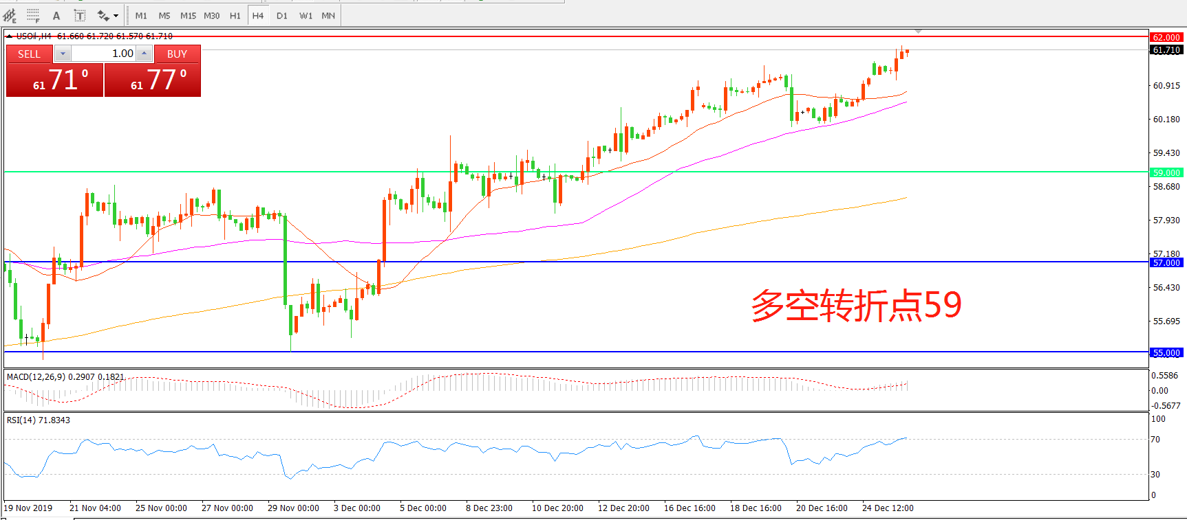 周四(12月26日),美国API数据利好持续发酵,美油延续上行,收报61.71美元/桶。在昨日的商务部例行发布会上,发言人高峰回应中美第一阶段经贸协议进展时称,中美正履行法律审核、翻译校对等手续,并就协议签署等后续工作密切沟通。贸易磋商的良好进展缓和了市场中的避险情绪,提振了原油等风险资产的表现。