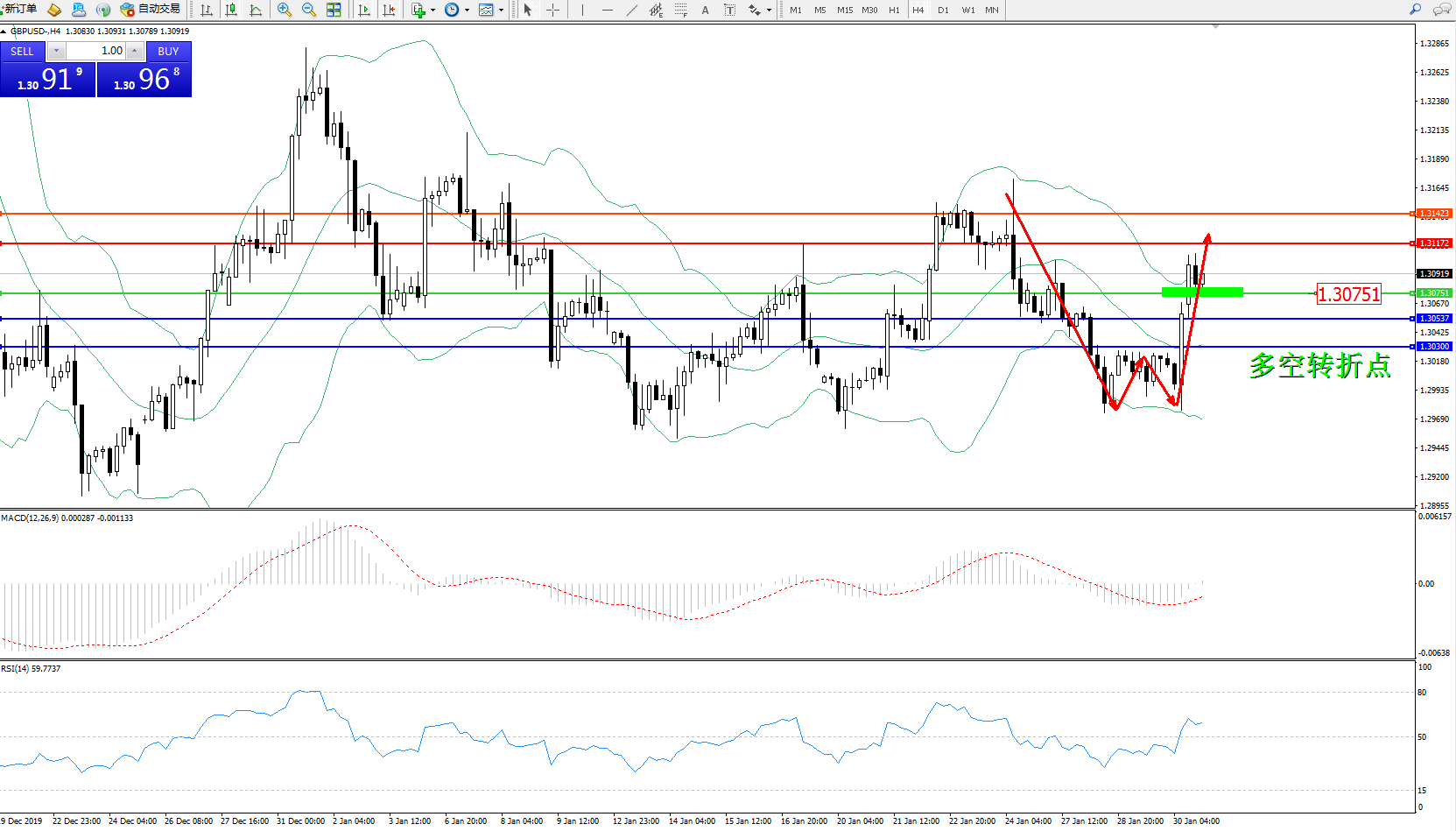 交易策略:1.30751上方看涨,目标1.31172、1.32423