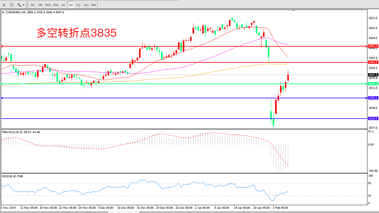 4小时图看,沪深300阳线连续拉升,整体表现强势,3835一线被突破后,距离跳空缺口仅一步之遥,均线系统走平,MACD绿柱缩短,RSI指标向下,日内延续上行概率较大。