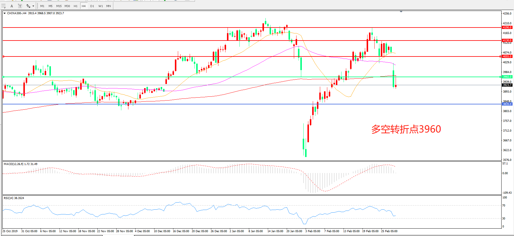 4小时图看,沪深300低开低走,整体表现低迷,3960成为上方阻力,短期均线走平,MACD红柱减少,RSI指标走平,日内延续震荡概率较大。