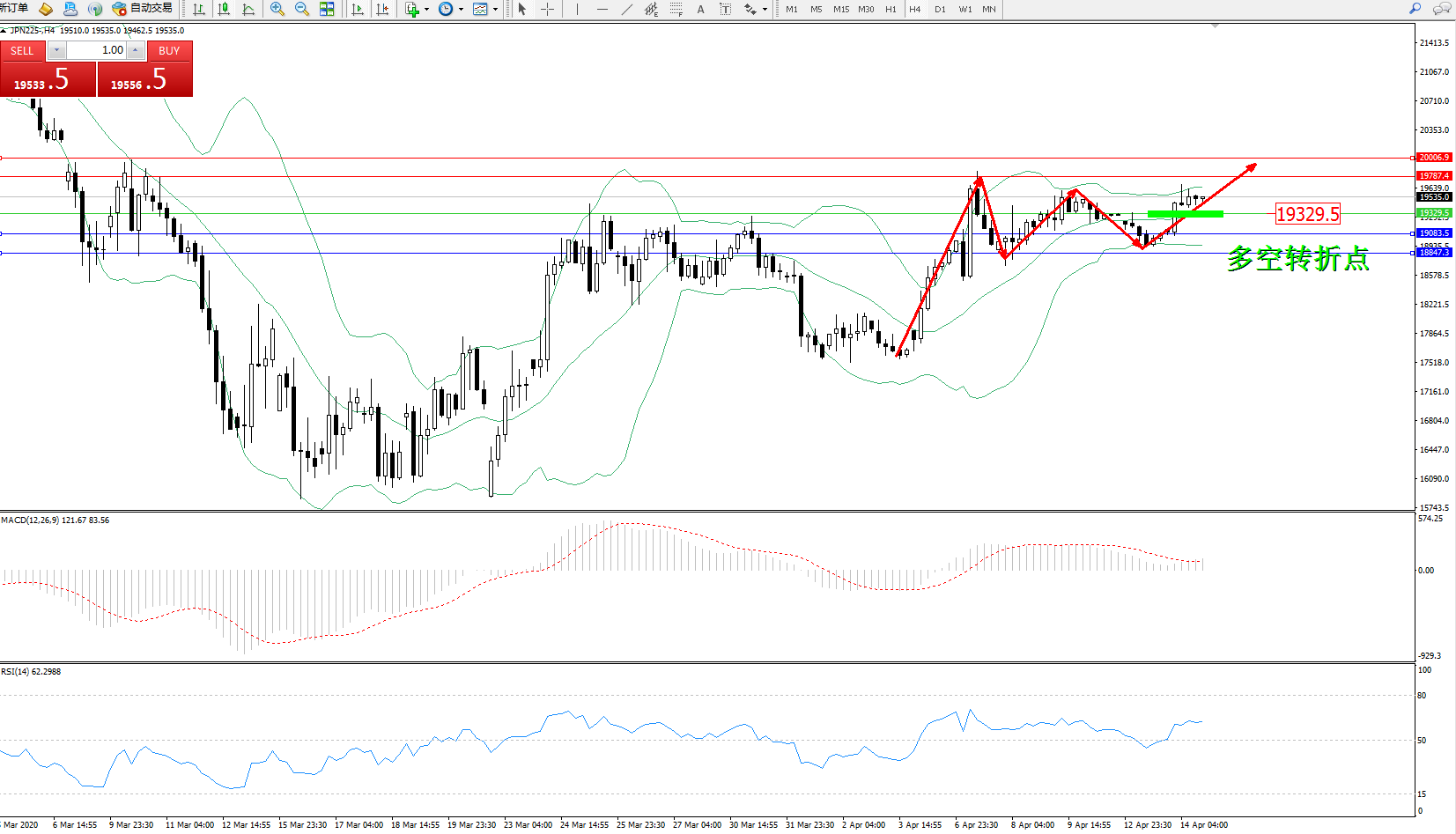 日经225指数4月14日(周二)收盘上涨586.60点,涨幅3.08%,报19630.00点。随着疫情令经济陷入衰退,促使各地央行推出庞大的刺激计划,市场担心新冠病毒大流行将对全球经济造成毁灭性影响,冲击企业收益,同时增加对避险资产的需求。在本月的利率政策评估中,日本央行将讨论采取进一步措施来缓解企业的融资压力。日本提供0.5万亿日元的国债以提供流动性,在最初阶段的讨论中,日本央行可能考虑的方案包括增加购买商业票据和公司债券,扩大作为抵押品的资产的可接受范围。日本经济再生大臣西村康稔:计划在5月内向受到新冠疫情影响而有需要的人发放现金。