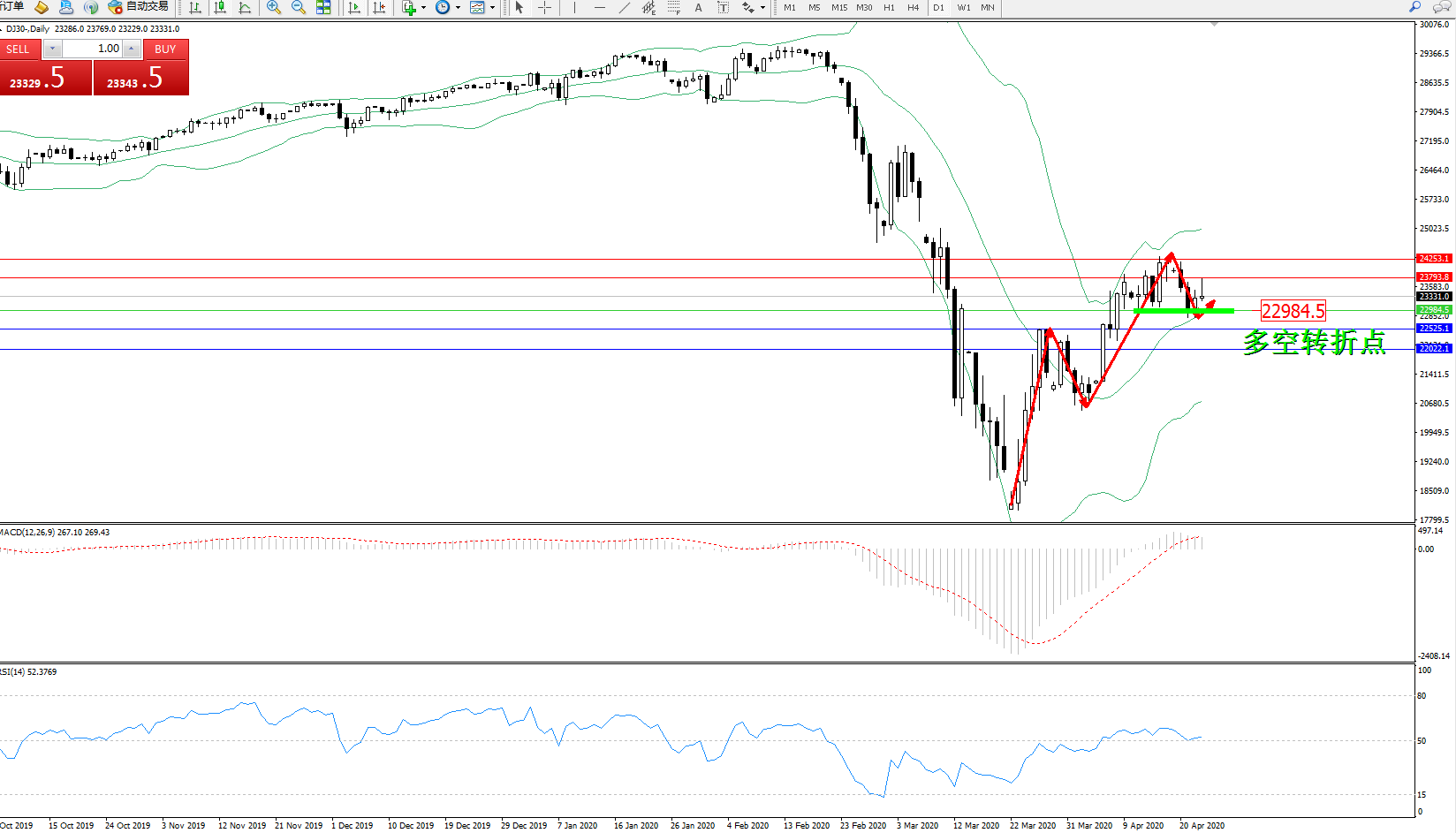 道琼斯指数4月23日(周四)收盘上涨39.40点,涨幅0.17%,报23515.26点。美股多数收跌,据报道称,一项领先的试验性新冠药物临床试验表现不佳,尽管数据显示美国上周首次申请失业救济人数大增440万,而且其它多项数据显示经济形势惨淡。资者把希望寄托在曲线持续变平和最终开发出疫苗上,他们愿意暂时无视负面的经济数据,关注那些表明当前不利因素可能被证明只是暂时的,那些更有利的发展,今天突如其来的反应展现了投资者在当前环境中的反复无常。美国众议院议员周四将齐聚华盛顿,通过一项4840亿美元的新冠疫情救助法案,使总获批援救金额达到空前的近3万亿美元。