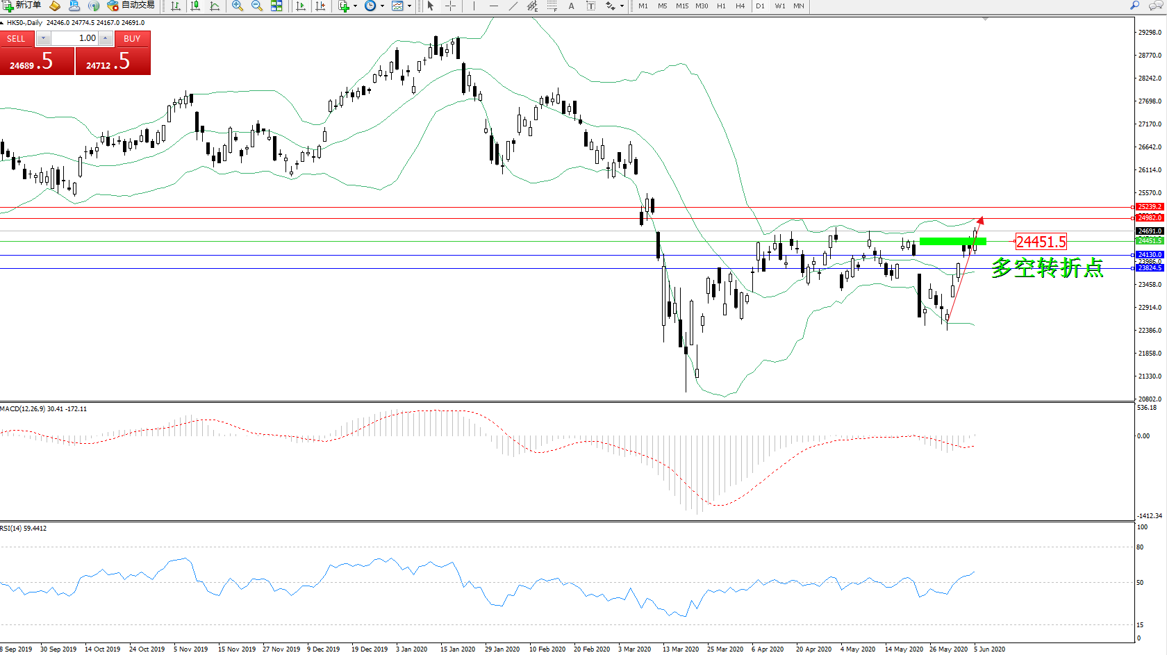 香港恒生指数6月5日(周五)收盘上涨404.11点,涨幅1.66%,报24770.41点;港股三大指数午后拉涨,尾盘一度涨近2%,国指涨0.99%报10066点。港A美三地股市快速走强 离岸、在岸人民币均升破7.09关口,美国贸易代表(USTR)莱特希泽在美东时间6月4日表态,对中国在中美第一阶段贸易协议的结构性改革和购买承诺都给予积极评价,称对协议“感觉很好”。盘面上,航空股全日强势,南航大涨近11%,国航涨8.63%;香港本地股午后爆发,带动市场情绪升温,恒生银行暴涨8.4%贡献恒指24点,九龙仓置业、太古股份公司A均大涨超6%;昨日强势的消费股回落明显,青岛啤酒、中粮肉食皆下跌。大市成交额为1348.66亿港元,南下资金净流入8.53亿港元。港元强势并触及强方兑换保证,金管局今日向市场沽出9.77亿港元。