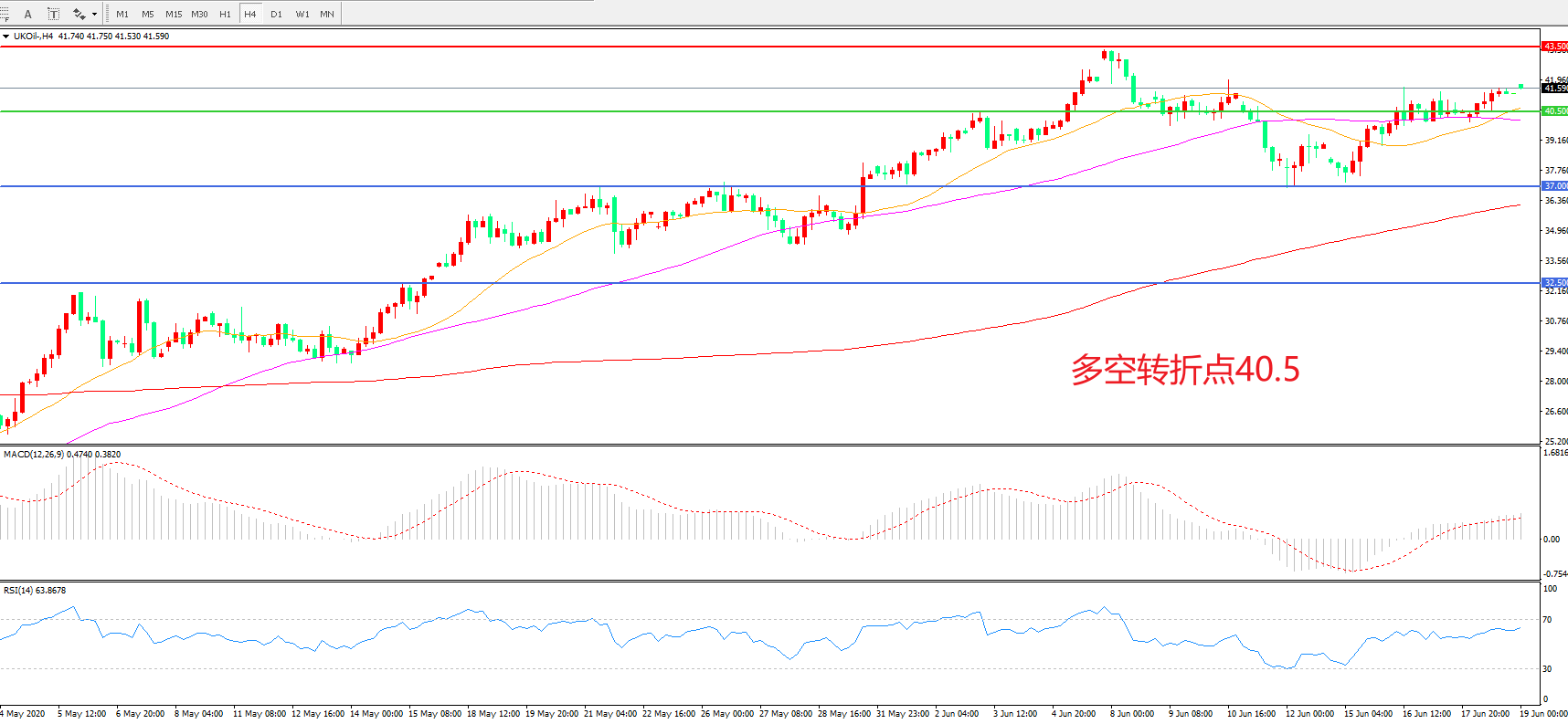 4小时图看,油价震荡反弹,40.5美元一线成为被突破,均线系统逐渐粘合,MACD红柱增加,RSI指标走平,日内延续震荡概率较大。