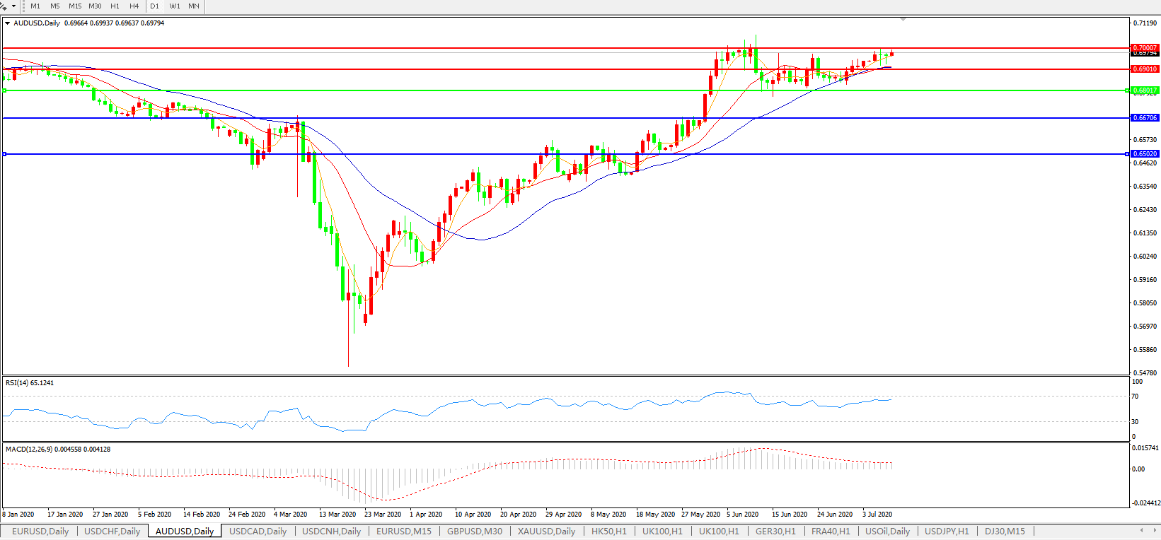 技术面简析:日图均线维持发散上行态势,汇价小幅走升但依旧承压,MACD运行于0轴上方但量能持续缩量,RSI缓步走平,预计汇价短线大概率将继续上攻,关注0.7000 关口压制。