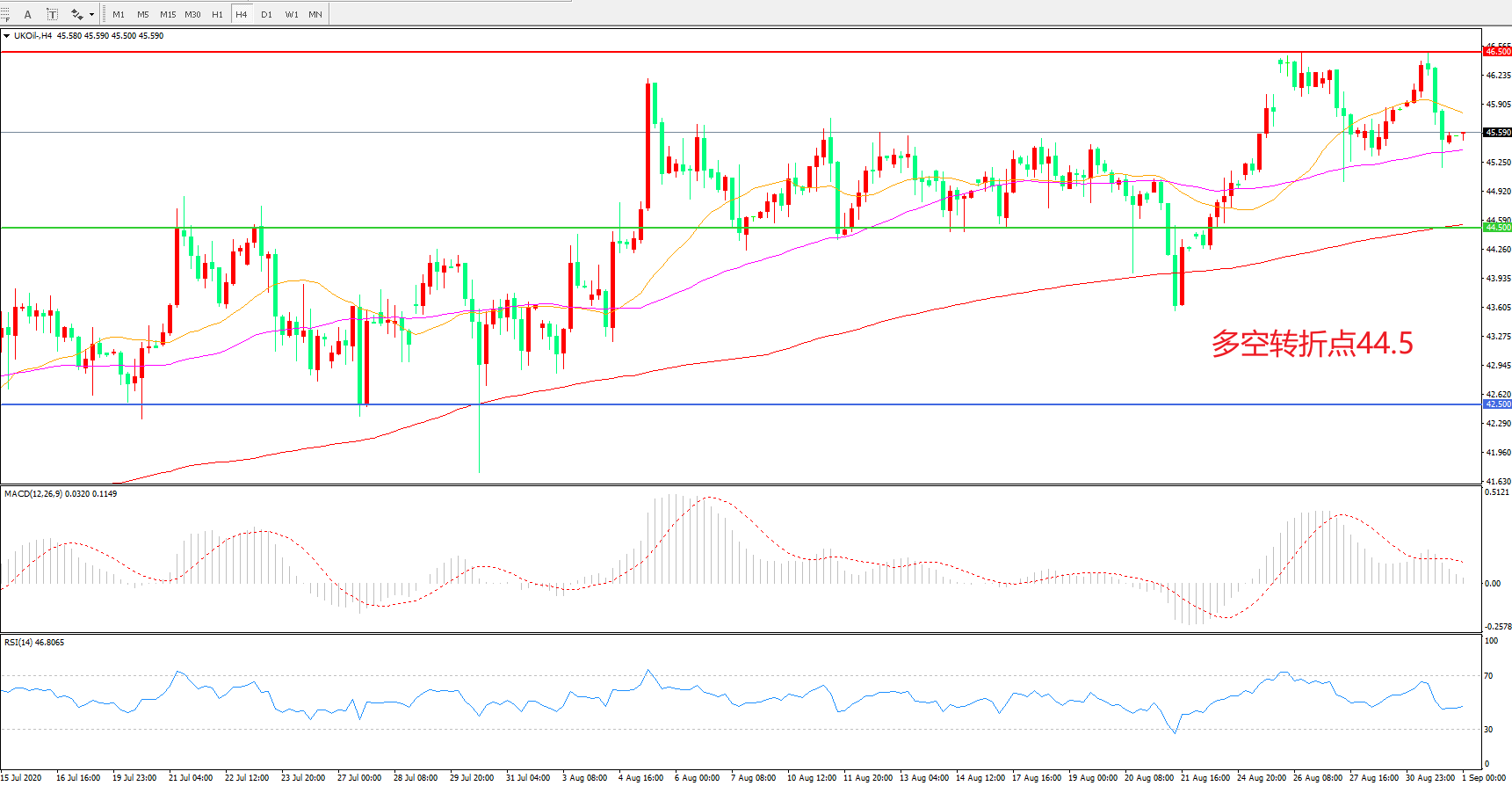 周一(8月31日),原油市场经历了动荡的一天,亚盘的走势仿佛给人一种想要突破的迹象,但是伴随着晚间美股的回落,布伦特原油震荡下行,收报45.55美元/桶。在供应过剩的市场环境下,需求难以恢复到疫情前水平,而美股的短期高位风险也给市场带来了较大的不确定性。