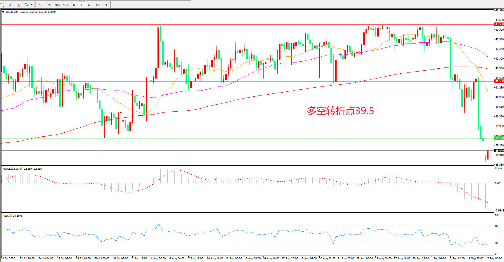 4小时图看,油价长阴连续下破,短期走势低迷,200周期均线被跌破,MACD绿柱增加,RSI指标走平,日内延续下行概率较大。
