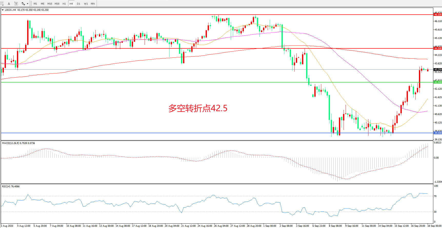 周四(9月17日),在欧佩克部长级监督委员会会议期间,沙特阿拉伯对其在该地区最亲密的盟友阿拉伯联合酋长国进行了几乎不加掩饰的斥责,表明了其阻止欧佩克及其成员国在生产配额上作弊的决心,伊拉克表示会很好地遵守,阿联酋也表示会对减产协议良好的执行。其中会议上还提到,如果十月份基本面情况恶化,那么OPEC+将有可能会进行进一步的减产动作。布伦特原油再度大幅回升,收报43.28美元/桶。