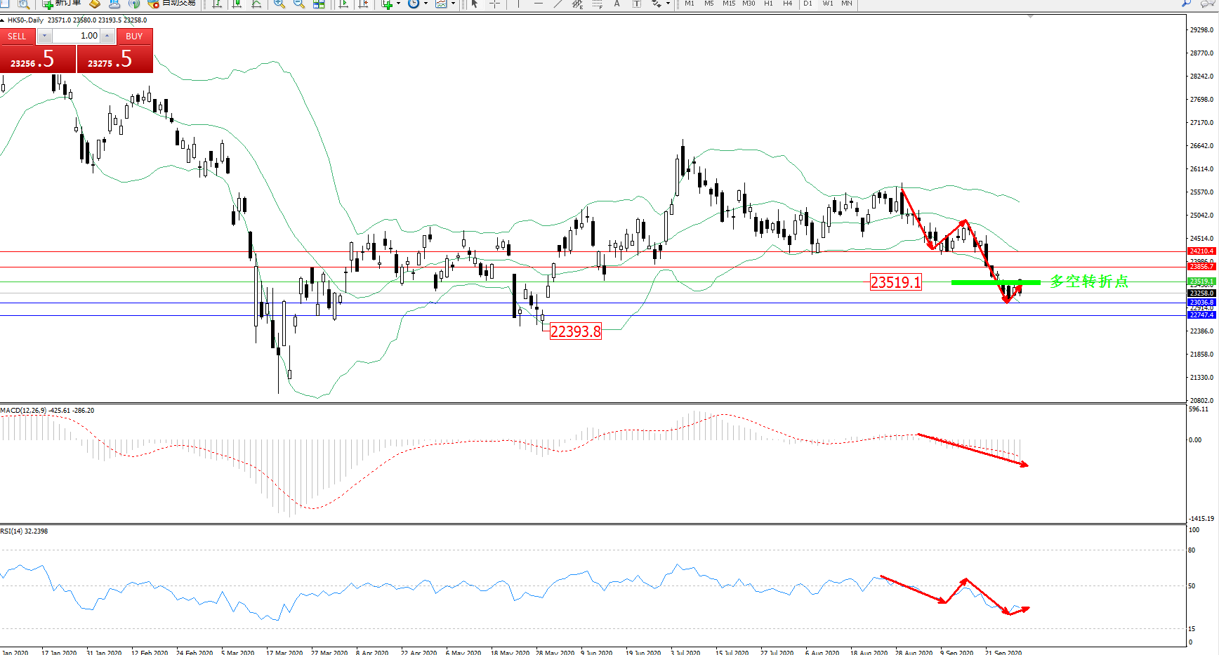 技术点评:空头动力处于布林带指标通道下轨持续震荡不断下移中,空头动力下破下轨后有继续下行态势,跌势未有止步迹象,前期低位22393位置近在咫尺,破位在即,布林带指标呈缓慢张口走势持续向下移动中,MACD指标处于0轴线下方空头区域维持弱势窄幅整理平缓慢向下移动中,RSI指标处于50均衡线下方空头区域维持弱势震荡中;