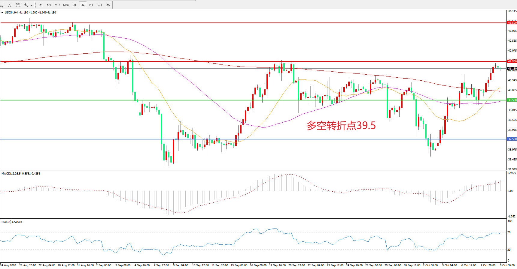 4小时图看,油价阳线连续拉升,短期表现较为强势,200周期均线被顺利突破,短期均线拐头向上,MACD红柱增加,RSI指标走平,日内延续上行概率较大。