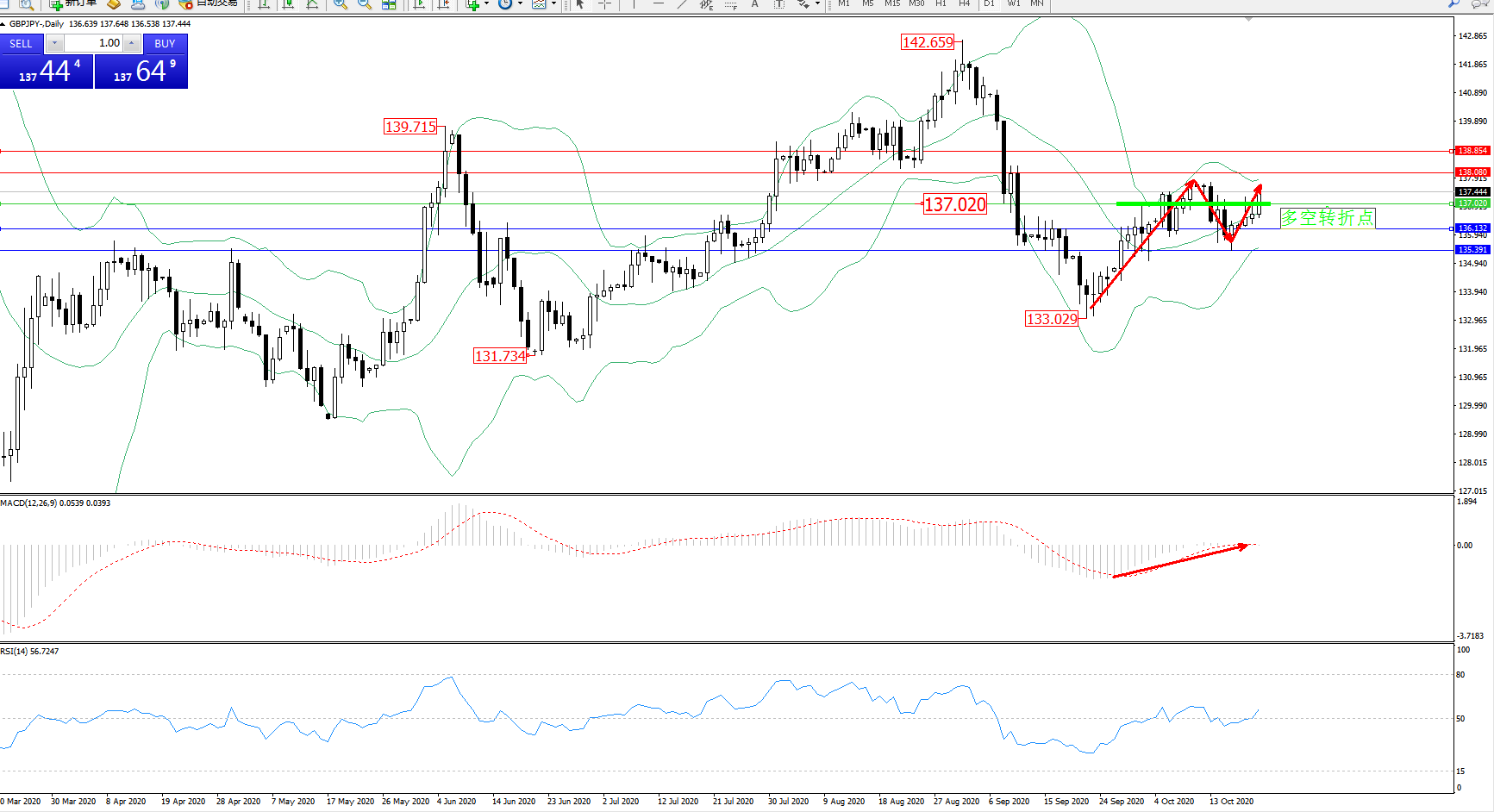英镑兑日元强势拉升至137.425附近,英国与欧盟的贸易谈判仍陷入僵局,距离年底达成协议的截止期限时间已经所剩不多。虽然最近发生波折,但这些情况不大可能实质性改变市场对于达成贸易协议的预期。市场仍然认为达成贸易协议是可能性最大的结果,英国央行副行长拉姆斯登:英国银行体系的结构不同于欧元区。英国银行资产负债表的压力可能会减轻。英国国家统计局表示,9月CPI较上年同期上升0.5%,涨幅高于8月时的0.2%,当时一项鼓励人们在餐厅用餐的短期计划压低了通胀率。经济学家平均预期9月通胀率升至0.5%。评级机构穆迪上周五将英国主权信用评级下调至与比利时和捷克相同的水平,并警告称英国财政实力减弱。