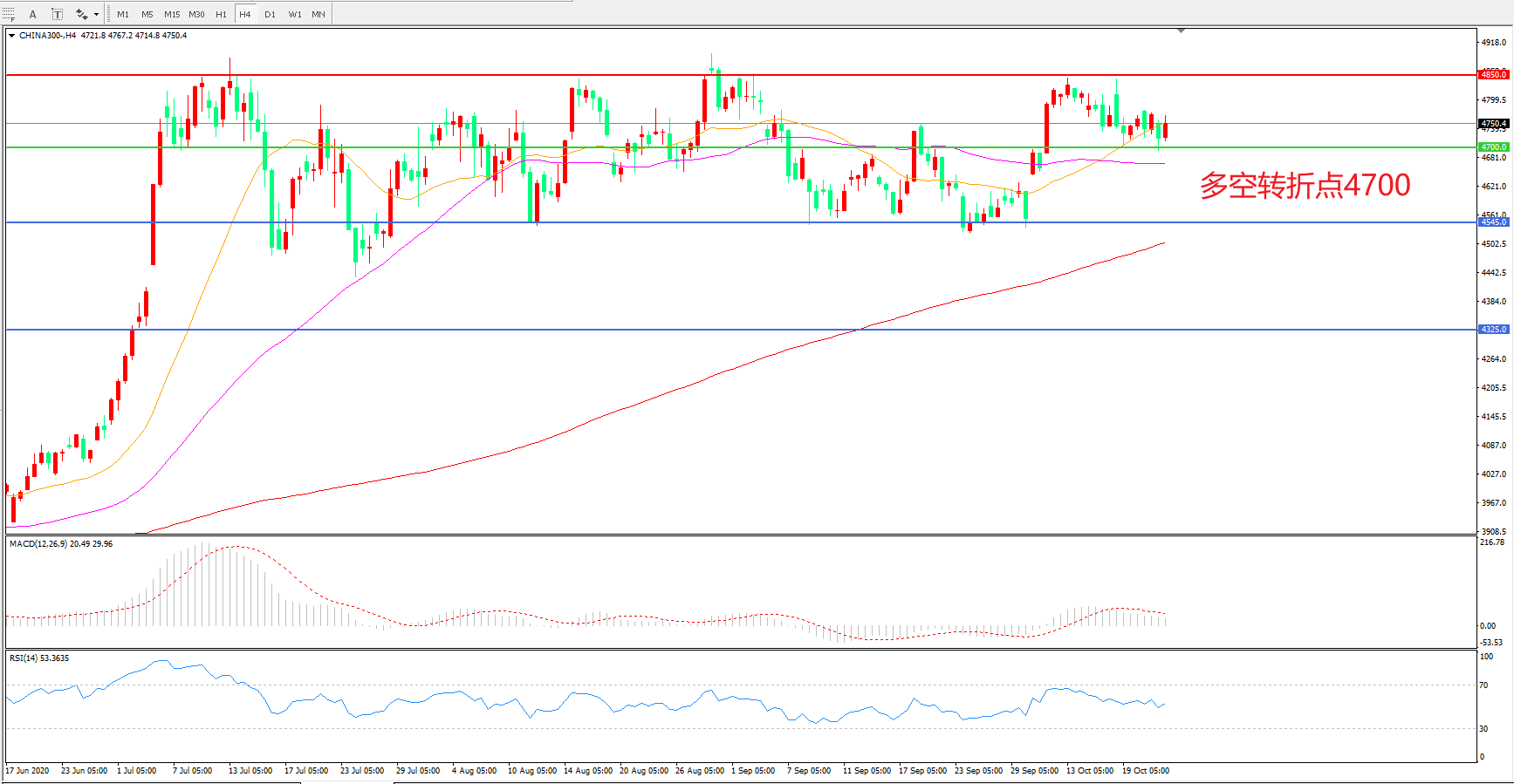 4小时图看,沪深300延续高位震荡,整体表现疲软,4850成为明显阻力,4700成为短期支撑,均线系统走平, MACD红柱缩短,RSI指标向上,日内延续震荡概率较大。