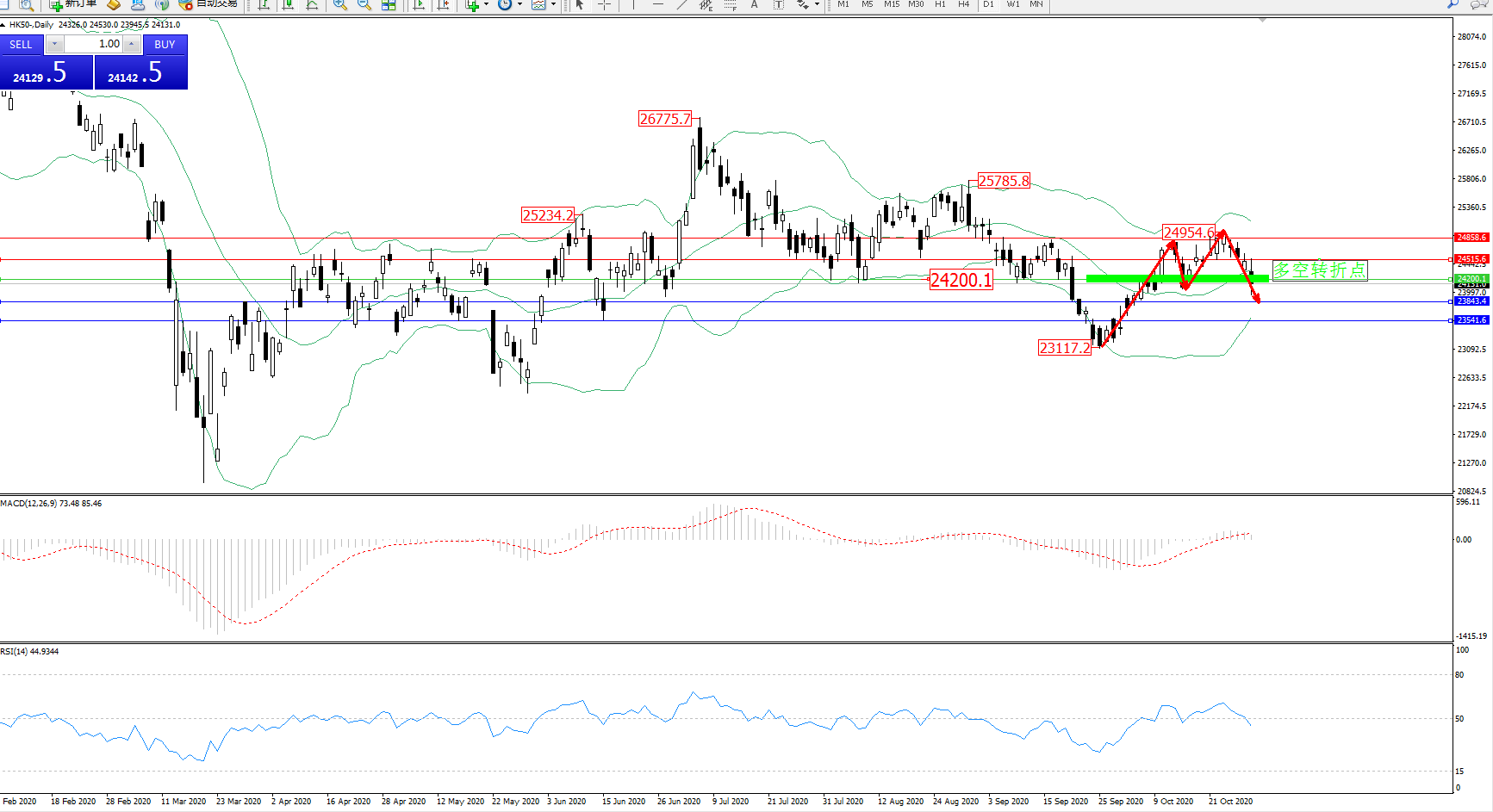 香港恒生指数10月30日(周五)收盘下跌479.18点,跌幅1.95%,报24107.42点;港股主要指数上午盘震荡上行,午后跳水下跌。恒指本月累计涨幅达2.76%,最高点为24970.59点,最低点为23674.52点。恒指险守两万四关口。恒生科技指数跌1.84%,苹果概念等板块盘中跌幅近持续扩大,市场情绪降至低点;中芯国际升超3%为最佳恒生科技股;权重科技股阿里、美团均跌3%,腾讯跌2.3%。今日南下资金逆势净流入64.81亿港元,大市成交额为1517.27亿港元。恒指目前已经呈现盈利下调,估值被动逆向上调的情况,说明估值已经见底。疫情带来的盈利负面影响主要反映在中期业绩,盈利预期大幅下调的空间也不大。港股估值或进一步向美股靠拢,提升整体中资股票在全球的吸引力,增加海外资金对中国市场的配置比例。在美元长期走弱背景下,人民币资产的配置价值进一步凸显。