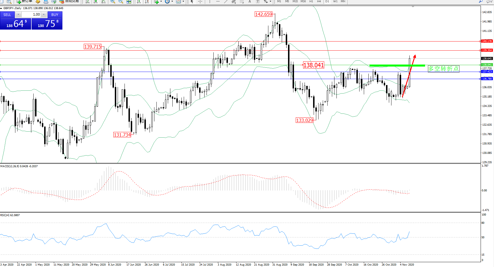 英镑兑日圆强势拉升至138.645附近震荡,受益于美元指数创逾两个月新低,非美货币普遍走高,而摩根士丹利表示,拜登对美英贸易协定可能将不那么开放,并比现任政府更致力于《贝尔法斯特协议》;这两个因素都将使平衡朝着英国与欧洲更紧密结盟的方向倾斜,并增加英国脱欧协议达成的几率。上周英国央行超预期扩大QE规模达1500亿美元,但是此举却从另一个方向显示该国央行短期内无意祭出预期中的量化宽松计划,在周一日内英国央行行长将再度讲话之前,市场仍对其言辞抱有乐观预期,不过,英国疫情及封锁措施带来经济冲击,市场也在继续关注英欧脱欧谈判的进展。脱欧进展当前总体乐观也是推动支撑英国经济的又一动力,但之后若局势再度出现反转。