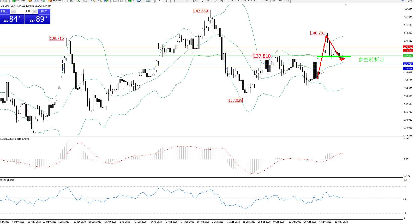 技术点评:多头动力延续布林带指标上轨附近强势拉升上扬后出现反转下移,高位抵达140.281附近后遇阻开始快速回撤,多头拉升动力短期结束,空头下行动力入场,触及布林带指标中轨附近节点前开始缓慢回升,布林带指标呈张口走势后有收口迹象,MACD指标低位多头多空持续震荡上扬至0轴线上方多头区域维持震荡,RSI指标处于50均衡线上方多头区域震荡后开始缓慢下行中;