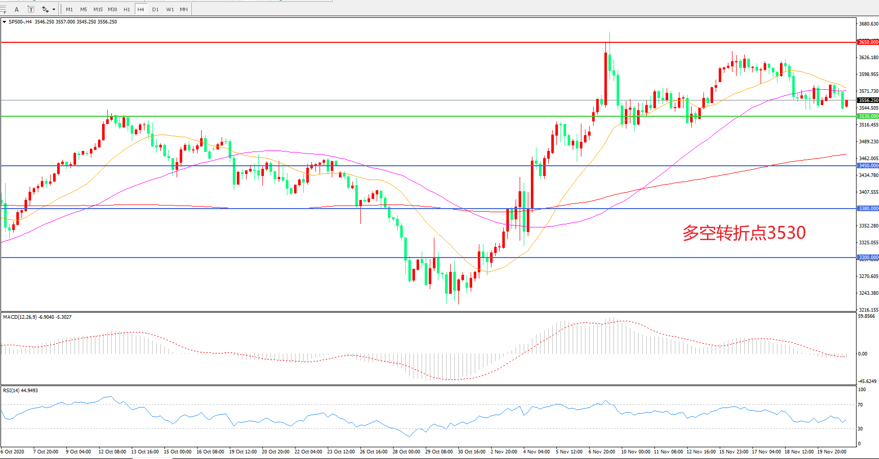 4小时图看,标普500冲高回落,整体表现相对低迷,均线系统走平成为短期阻力,3530成为短期支撑,MACD绿柱增加,RSI指标走平,日内延续震荡概率较大。