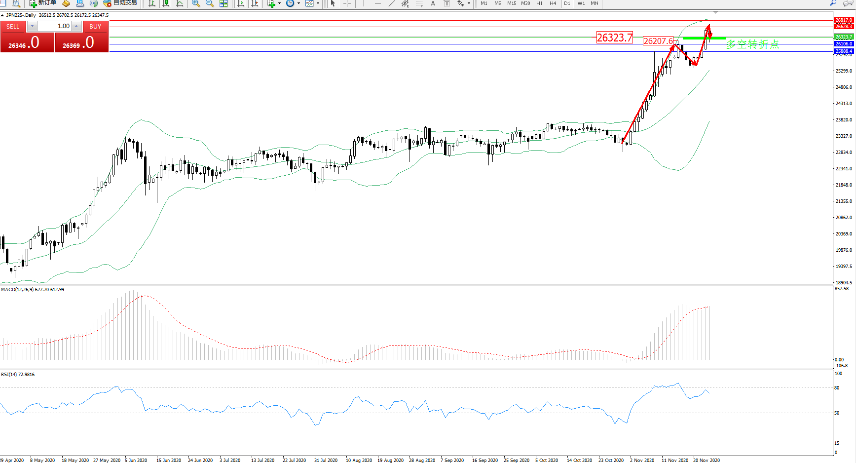 日经225指数11月25日(周三)收盘上涨138.91点,涨幅0.53%,报26304.50点。日本首相菅义伟在东京会见对日本进行正式访问的国务委员兼外长王毅。王毅说,下一步,中方愿同日方着力构建契合新时代要求的中日关系,使这一目标早日落地、开花结果,惠及两国人民,并为迎接2022年中日邦交正常化50周年打下坚实基础。一要建立真正互信,妥处敏感问题,推进全方位合作;二要推进区域合作,加快自贸区建设,共同开创亚洲美好未来;三要共同致力于全球治理体系改革,推动全球化朝着更加开放、包容、共赢方向发展,承担起两国应尽的国际责任。