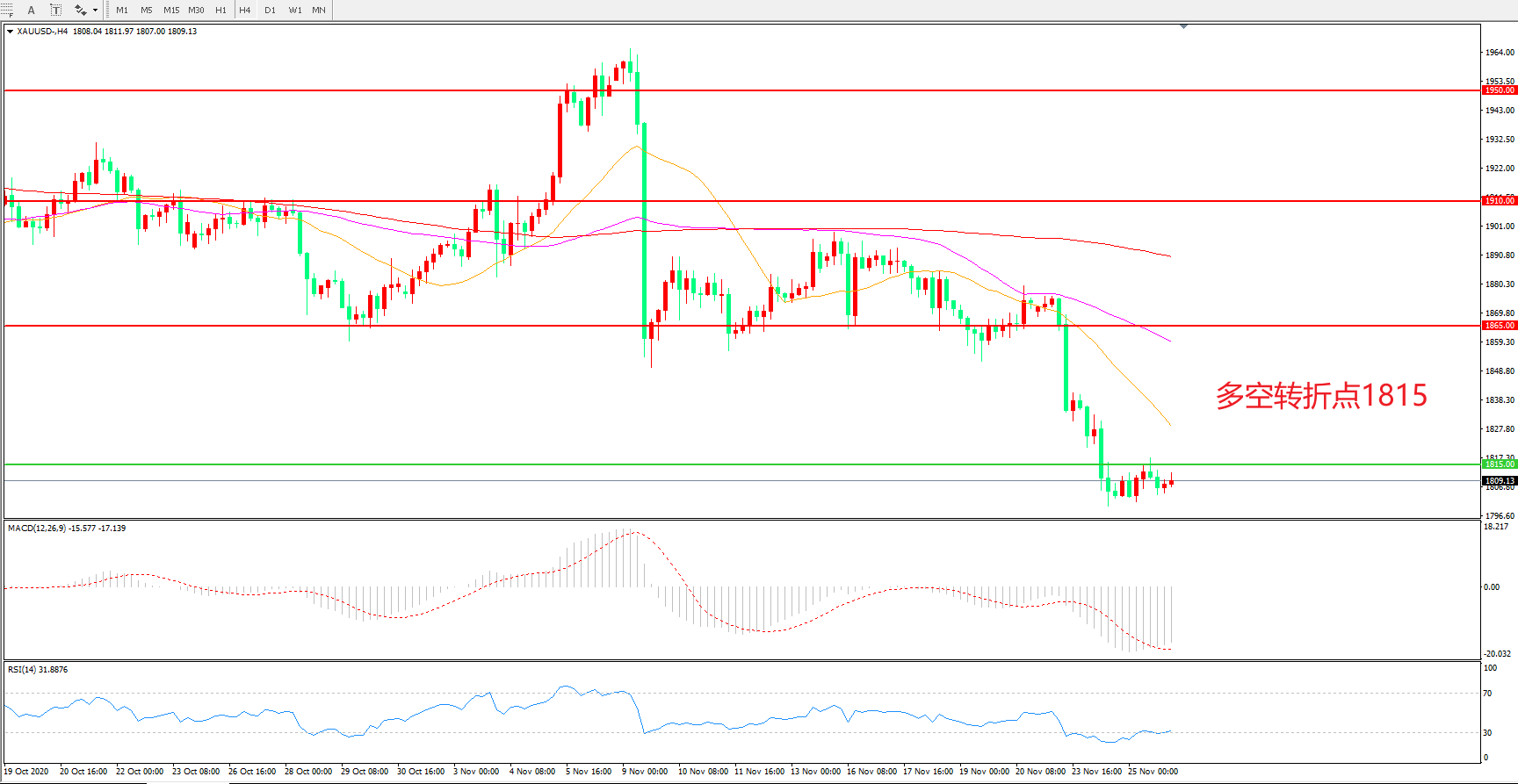 4小时图看,金价长阴下破后延续窄幅震荡,短期走势十分低迷,均线系统呈空头排列,1815成为多空分水岭, MACD绿柱增加,RSI指标走平,日内延续下行概率较大。