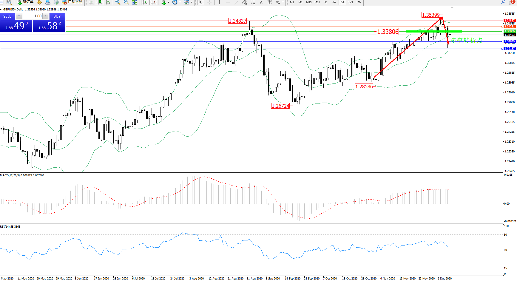 交易策略:1.33806下方看跌,目标1.32839、1.32157