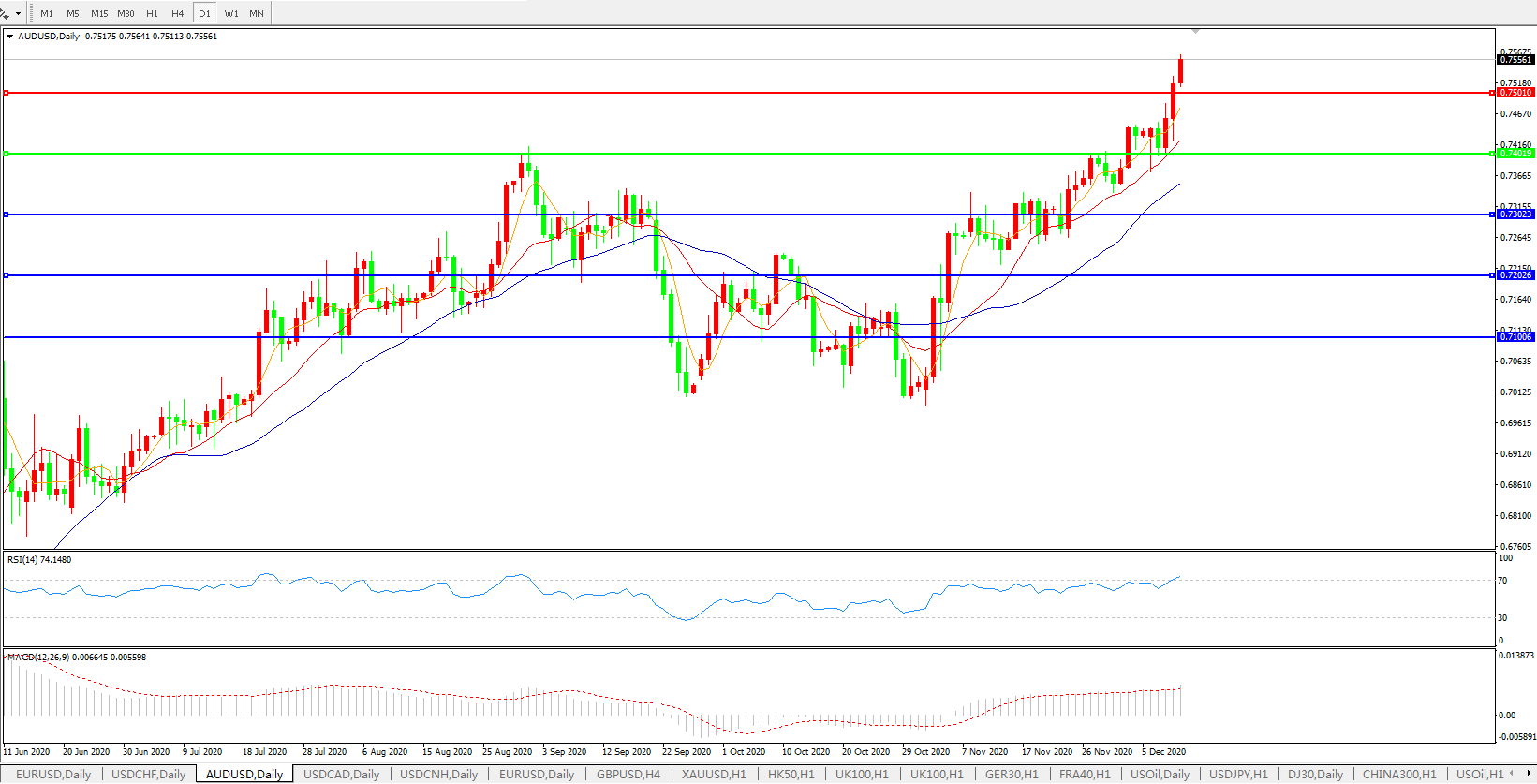 澳元兑美元在周四纽约时段冲高至两年半新高0.7540,站稳0.75关口的时间点比市场预期的更早,部分原因在于在美国财政协议仍然陷入僵局的状况下,美联储下周强化宽松的预期进一步升温。而与此同时,全球商品期货价格则同时因为美元贬值和需求预期在全球多个大力投资基建的背景下走强,进一步拉动了商品系货币汇价; 这意味着澳元汇价短期内仍有上行趋势。虽然澳元汇率的持续走强可能会引发澳洲联储的顾虑,但考虑到澳洲联储的下一次政策会议要到明年2月份才举行,在年关之际澳元的强势将不会受到明显冲击,汇价进一步目标位将上指0.7677。