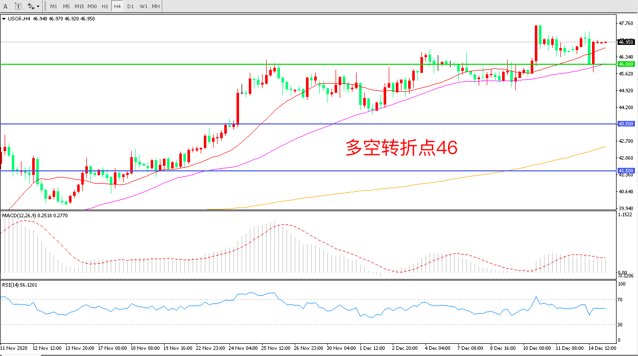 周一1214疫苗接种形势提振需求前景,油价涨超1%,但OPEC再度削减今明两年全球石油需求预期令市场情绪再度承压美国WTI原油延续高位震荡收报46.94美元/目前来看,原油多头的韧性依然比较强。