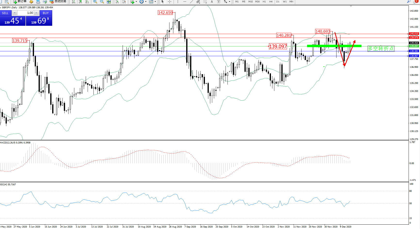 英镑兑日圆强势拉升至139.454附近震荡,市场对英国脱欧谈判前景重趋乐观;欧盟首席英国脱欧事务谈判代表巴尼耶日内表示,在与英国的谈判中仍有两项关键议题存在分歧。但是从乐观的角度来看,这也反过来意味着谈判在其他领域都已经达成共识,只需双方在最后两项问题上谈妥,会谈就可以圆满落幕。投资者面对英国脱欧谈判的潜在前景,在当前反而已经变得豁达释然起来;疫苗接种行动正式开始,第一批新冠疫苗(包括瑞辉和Moderna疫苗)已经通过卡车和飞机运出,专家表示美国有望在12月底前发放约4000万剂疫苗,可供2000万人接种,到明年3月底将有超过1亿美国人接种疫苗,市场对于全球经济复苏的希冀提升。