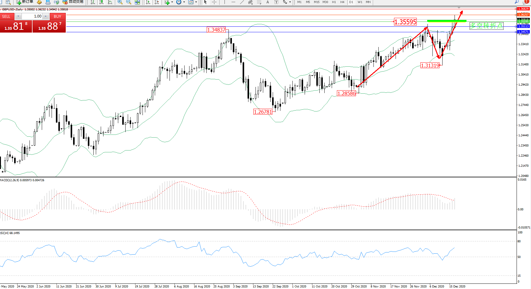 交易策略:1.35595上方看涨,目标1.36257、1.36829