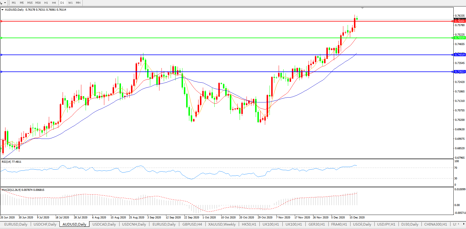 澳元兑美元在周四延续升势,一举进一步突破0.76关口,触及2018年6月以来两年半新高0.7628,因美元指数在美联储隔夜决议之后再度走软。虽然美联储决议中并未如预期进一步在台面上扩大宽松力度,但市场经过解读后押注其将继续维持强力货币增发力度,这对美元汇价继续利空,并推动非美货币走强;同时,日内继续回暖的全球市场风险情绪也对澳元汇价构成额外利多,因投资者对疫苗研发与应用前景继续看好,并看多2021年全球经济前景,而在经济复苏且美联储政策依旧宽松的背景下,商品系货币都会相对美元录得可观的涨幅。当前澳洲所面临的贸易环境风险也被市场解读为不足为惧,这都令澳元兑美元在2021年上半年有进一步涨上0.80关口的潜力。