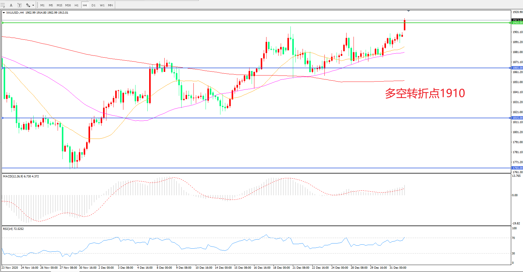 2020年最后一个交易日,现货黄金日内维持震荡,随后持续走高并收复失地,并一度重回1900美元关口,2020年全年,现货黄金累涨逾370美元,涨幅近25%,录得2010年以来最大年度涨幅。2021年首个交易日,现货黄金跳空高开,暴力拉升,现报1912.52美元/盎司。
