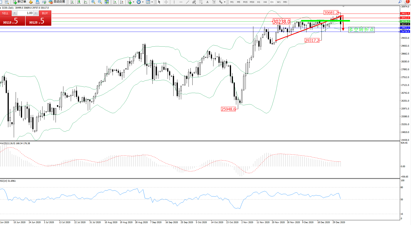 道琼斯指数DJ30—— 日K线图显示: