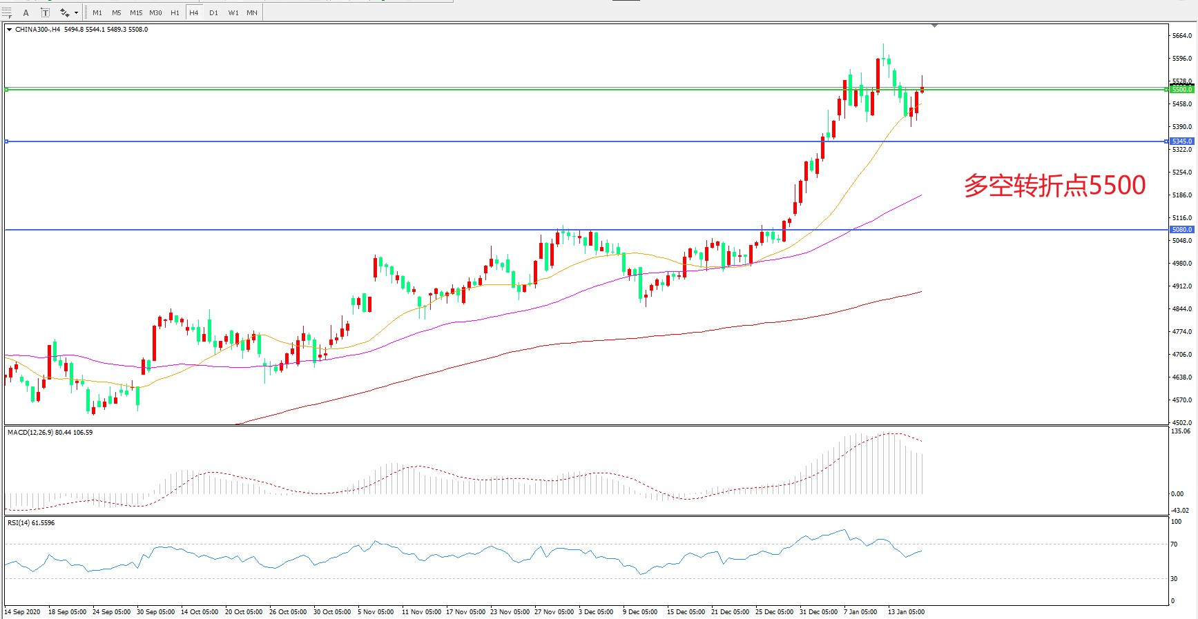 4小时图看,沪深300回踩21周期均线后震荡拉升,短期走势回暖,5500再次成为多空分水岭,均线系统呈多头排列,MACD红柱增加,RSI指标走平,日内延续上行概率较大。