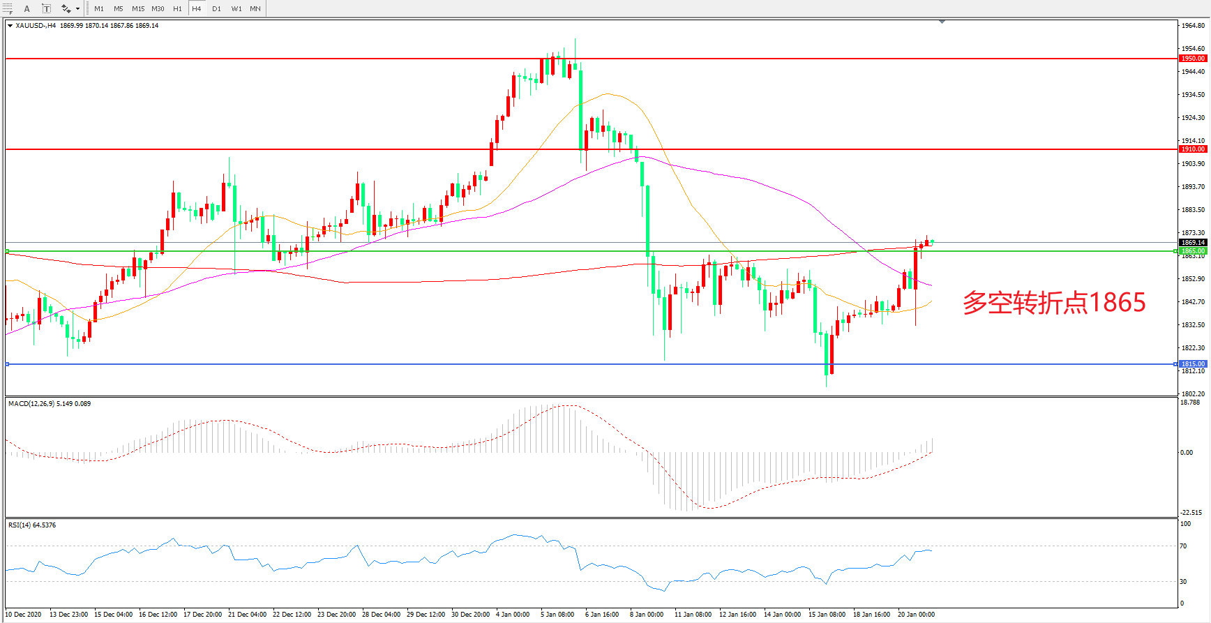 周三(1月20日),上周提议推出1.9万亿美元经济刺激案的拜登正式担任美国总统,他与鸽派耶伦的相互配合意味着政府出台更多经济刺激政策更加容易,市场再通胀胀交易回升,金价大幅上行,收报1868.48美元/盎司,创1月7日以来收盘新高,并创1月4日以来最大涨幅,随着美国10年期国债收益率和美元阶段性反弹到位,黄金或开启新一轮涨势。