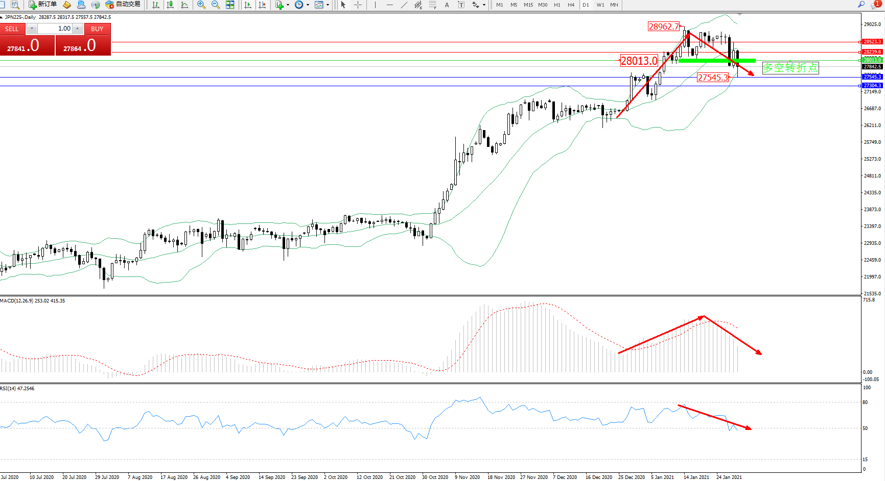 日经225指数1月29日(周五)收盘下跌538.42点,跌幅1.91%,报27659.00点。美元受到避险因素支撑,即使接种疫苗在增加,但人们对全球经济衰退的担忧仍然使得投资者涌向美元现金。市场期盼已久的美国刺激措施仍然美元结果,这侧面支持美元。尽管最近取得了进展,但期待已久的美国刺激方案仍然在参议院内部动摇;日本1月东京CPI年率录得-0.5%,而市场预期-0.9%;此外,日本12月失业率实际公布2.9%,预期3%。此外,日本央行的决策者讨论了允许长期债券收益率在银行目标范围内更广泛波动的情况;由于市场缺乏主要数据,交易者应该关注股票新闻,另外也要关注美国援助刺激计划的谈判情况。日本经济产业省调查的制造业者预计,1月和2月的产出料分别为增加8.9%和减少0.3%。政府维持对工业生产的评估不变,称其正在回升。11月工厂产出下滑,因全球需求低迷导致汽车制造的反弹告一段落。部分分析师担心这可能令日本经济复苏偏离轨道,并导致再度出现衰退的风险升高。
