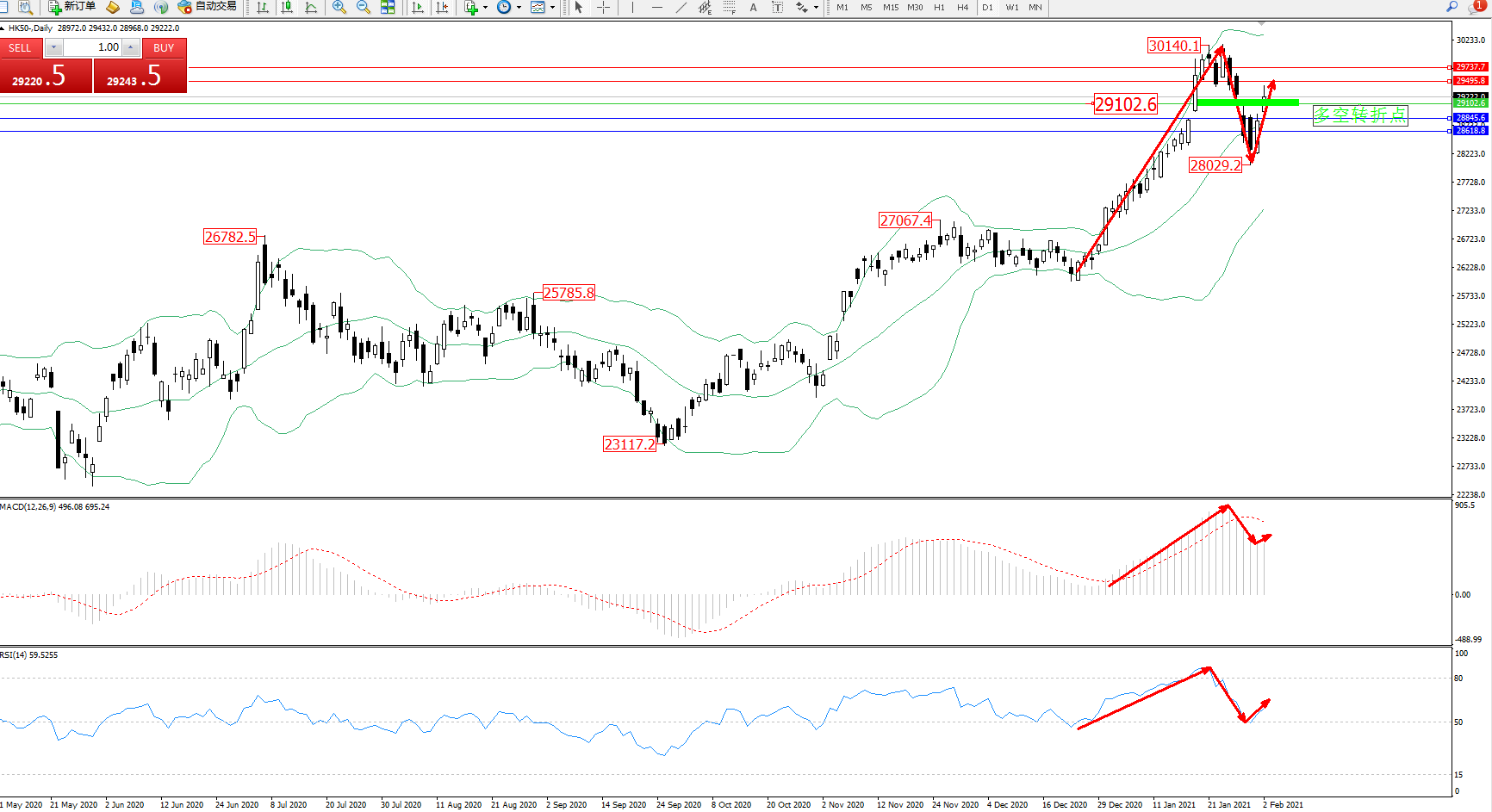 技术点评:多头动力延续布林带指标通道中上轨区间持续震荡上扬至30140位置节点后遇阻开始急速回撤下行,抵达28029位置得到支撑后再度反转向上拉升上扬,处于布林带指标中轨上方震荡中,多头动力有继续上行态势,MACD指标处于多头区域高位震荡回撤后开始走平,RSI指标处于多头区域高位回撤至50均衡线附近节点后得到支撑反转上行中;