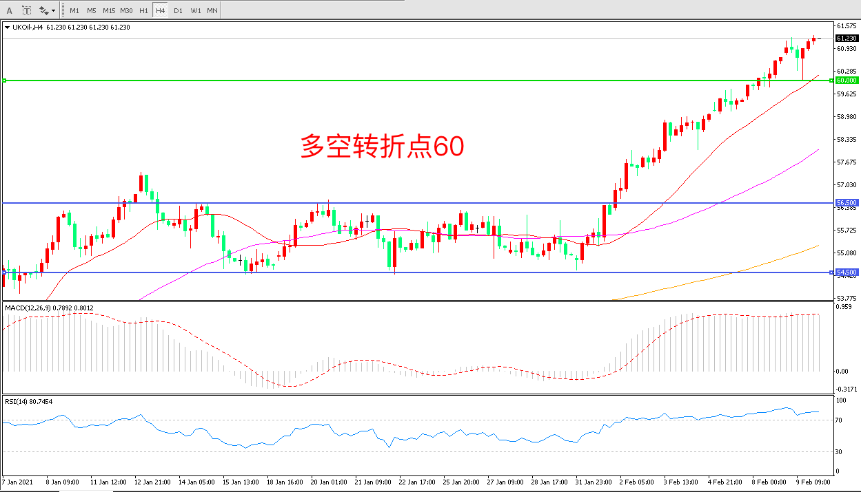 4小时图看,油价连续拉升,整体表现偏强,60阻力被快速突破,多头趋势已经形成,MACD红柱增加,RSI指标向上,日内延续上行概率较大。