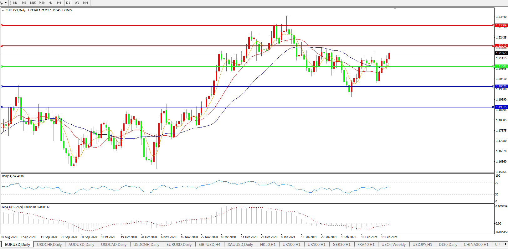 荷兰国际集团表示,欧元上周最后一个交易日收涨,涨势延续至周一(2月22日),开起来有望开启新一波上行走势;但该机构也指出,年初以来,欧元总体处于震荡调整格局中,完全排除进一步下跌的风险,汇价须上破颈线位——2月16日高点1.2169。周一公布的调查显示,德国2月企业信心触及10月以来最高,升幅远大于预期,因尽管有封锁限制,工业领域仍给予德国经济动力。德国商业银行分析师Ulrich Leuchtmann称,欧元兑美元汇率将取决于“美国经济是否真的能实现比欧洲更强劲的后封锁繁荣”。