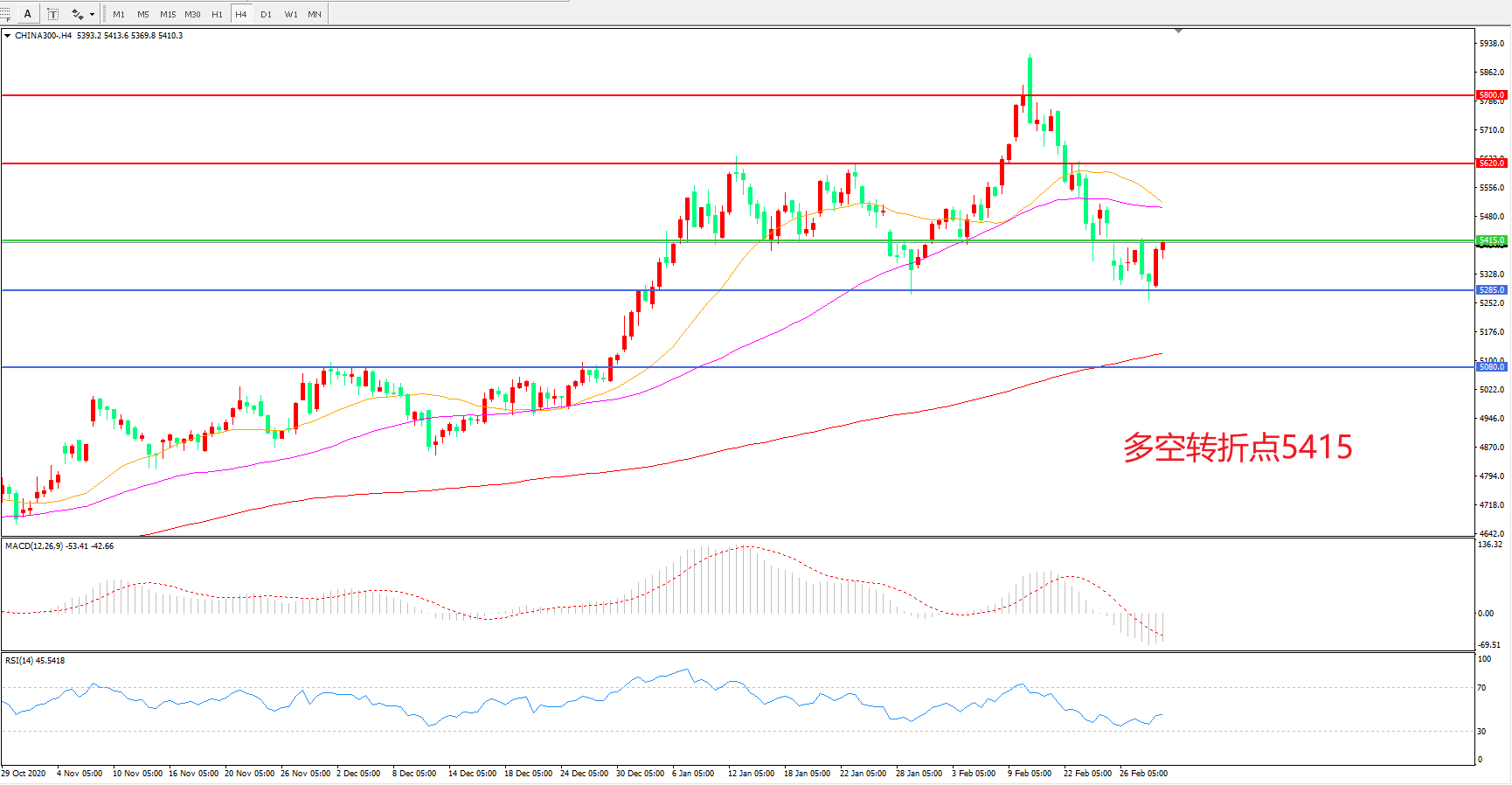 4小时图看,沪深300回踩5285一线后小幅反弹,短期走势有所回暖,但并未突破5415阻力,短期均线拐头向下,MACD绿柱增加,RSI指标走平,日内延续震荡概率较大。