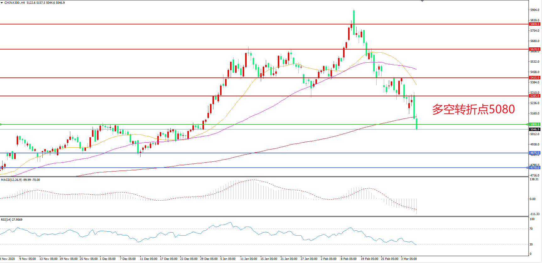 4小时图看,沪深300连续长阴下破,整体表现相对低迷,200周期均线被跌破,MACD绿柱增加,RSI指标走平,日内延续下行概率较大。