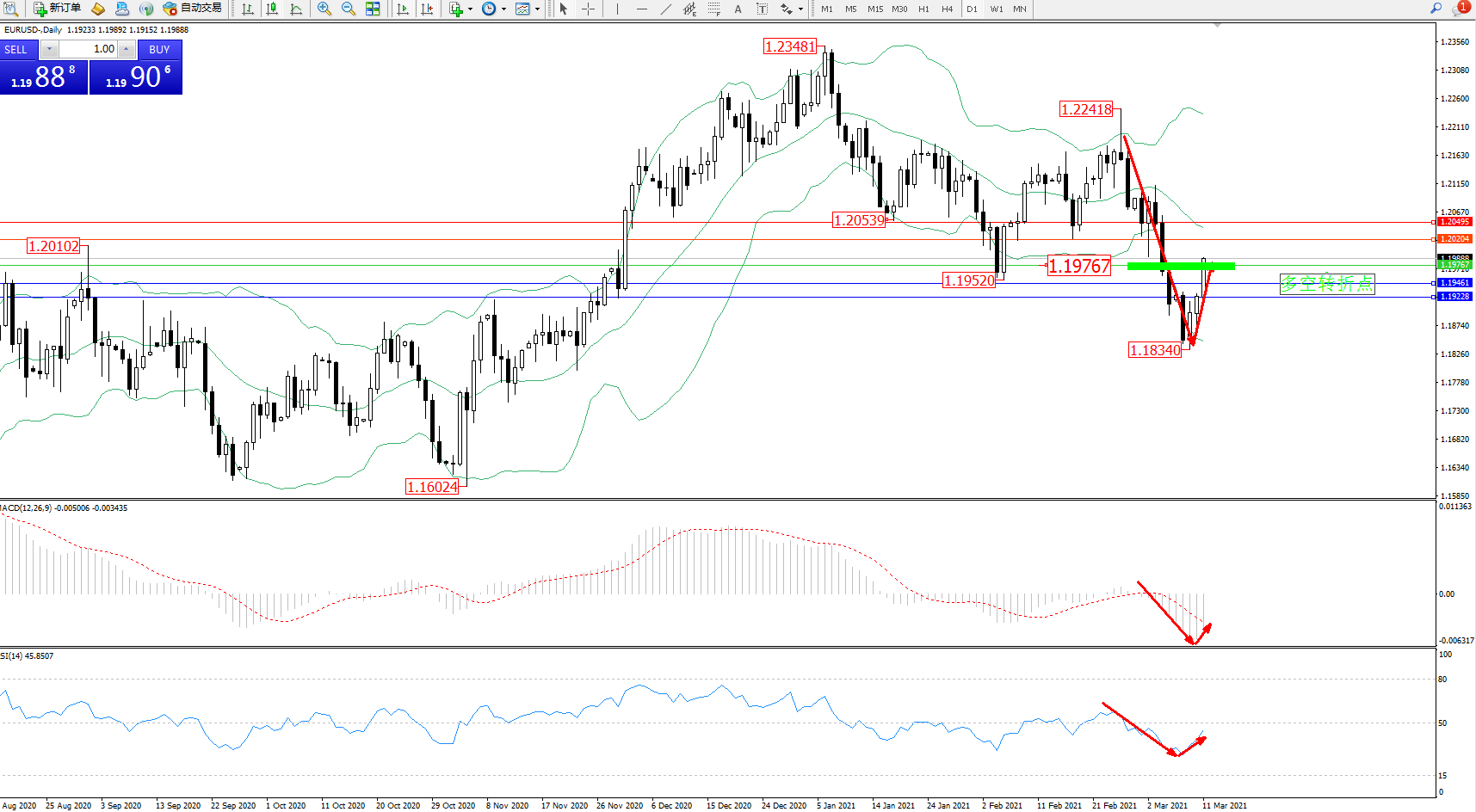 技术点评:空头动力延续布林带指标下轨附近持续震荡向下移动态势良好,低位抵达1.18340位置节点后出现快速回升走势,低位多头动力强势反转上移,布林带指标呈张口走势开始收口,MACD指标空头动力持续震荡下行后开始反转向上移动,RSI指标空头动力维持震荡持续震荡下行后反转向上移动中;