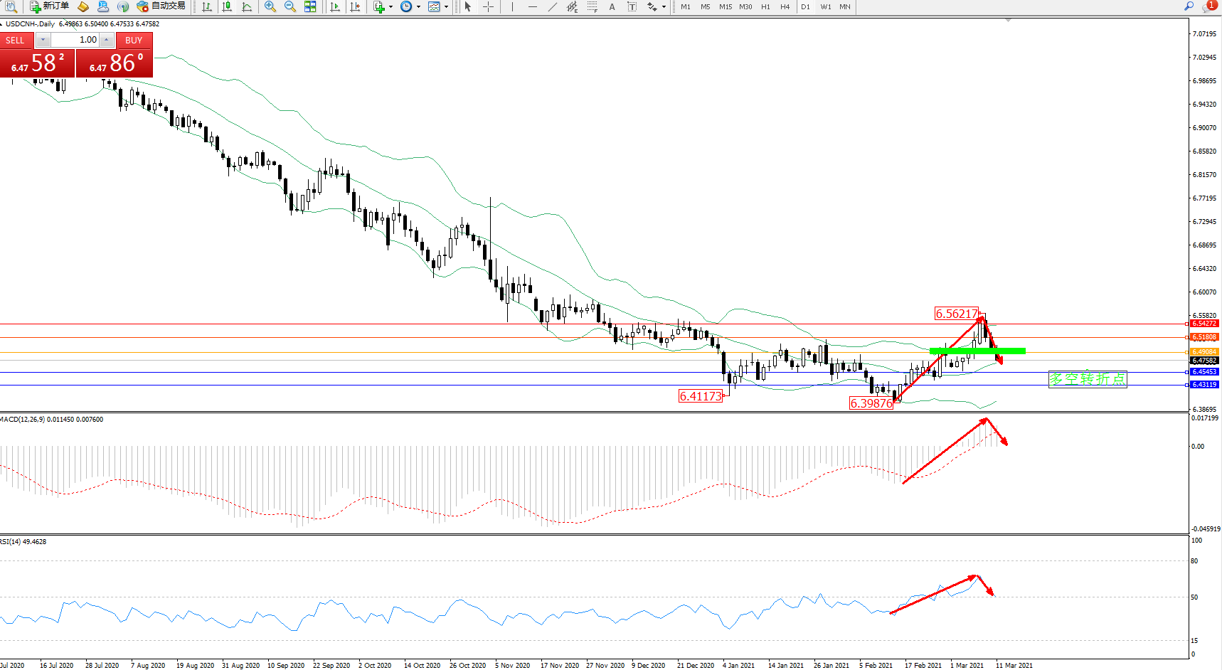 美元人民币USDCNH——日K线图显示: