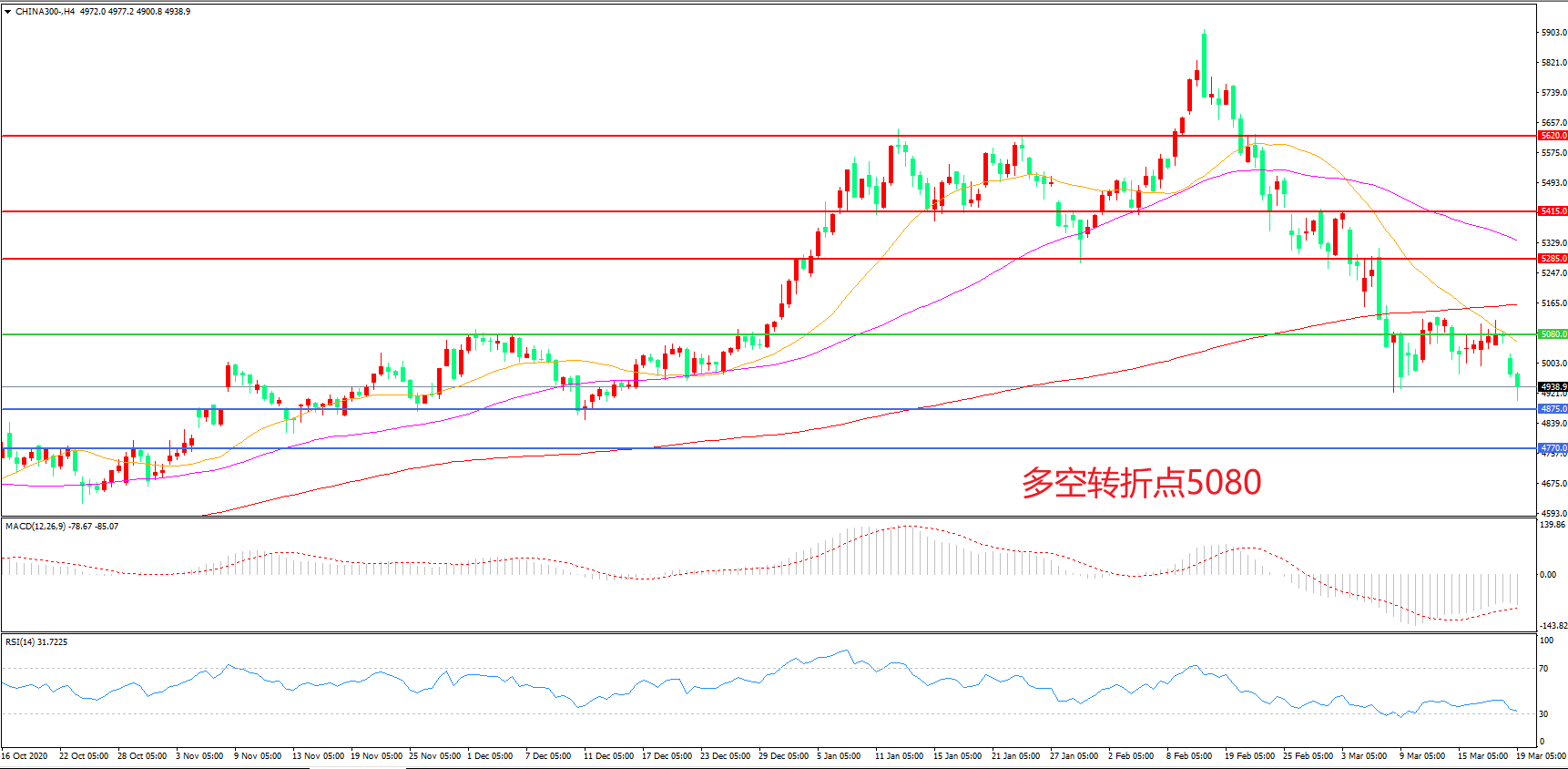 4小时图看,沪深300低开低走,整体走势十分低迷,21周期均线成为上方阻力,MACD绿柱增加,RSI指标走平,日内延续震荡概率较大。