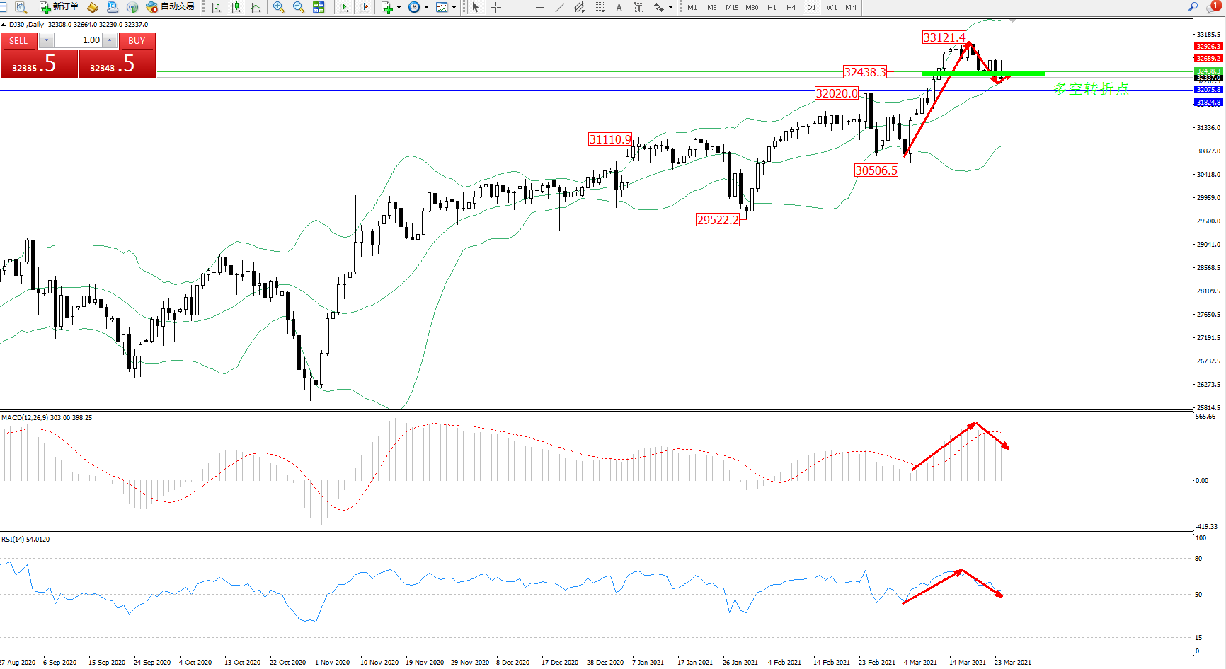 技术点评:多头动力延续布林带指标上轨附近节点持续震荡上扬,高位抵达33121附近节点后遇阻出现回撤,触及布林带指标中轨附近节点得到短暂支撑开始整理,布林带指标呈张口走势后开始收口,MACD指标处于多头区域维持整理有缓慢下移迹象,RSI指标处于多头区域维持整理缓慢下行即将触及50均衡线附近整理,
