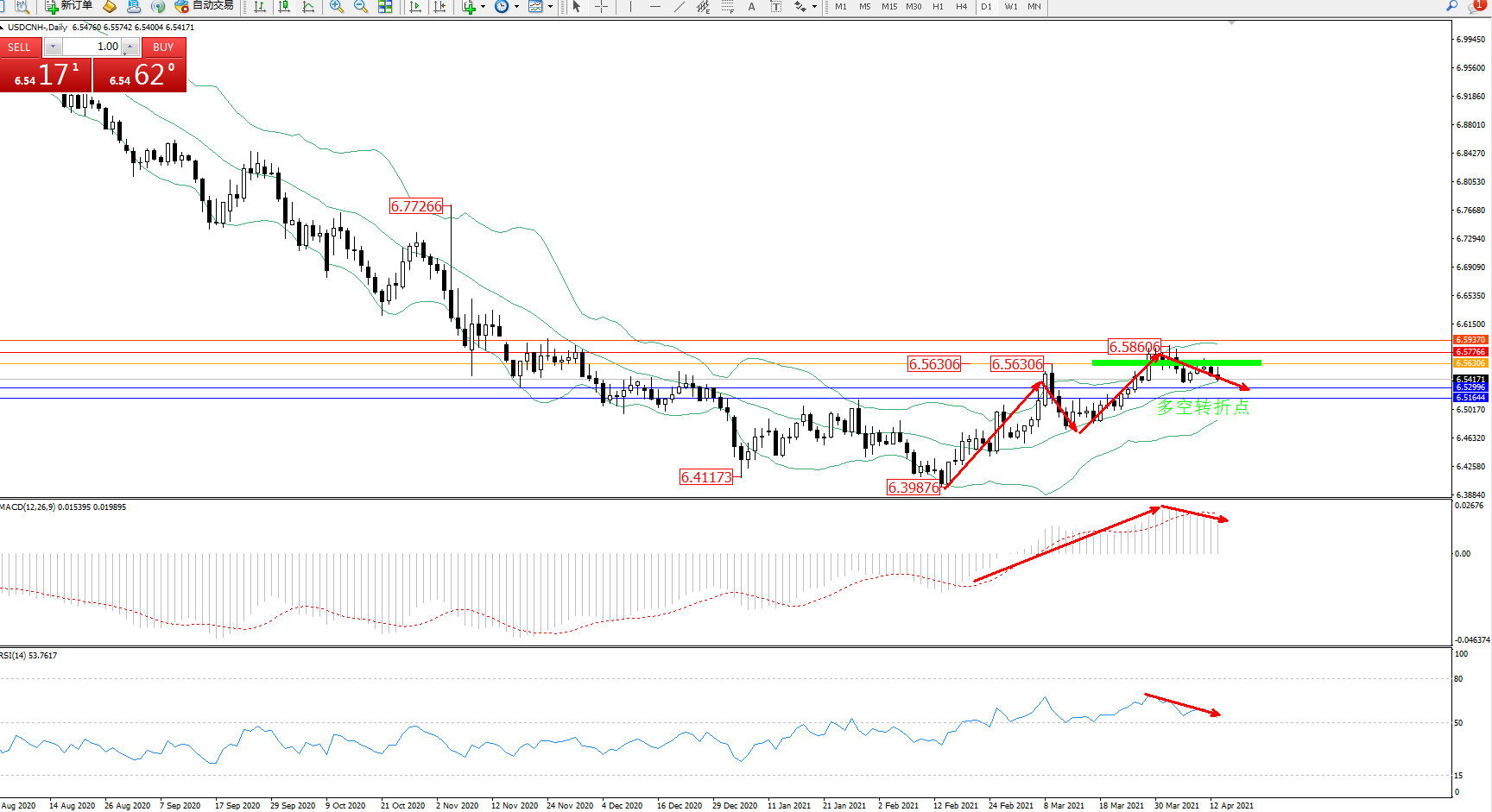美元人民币USDCNH——日K线图显示: