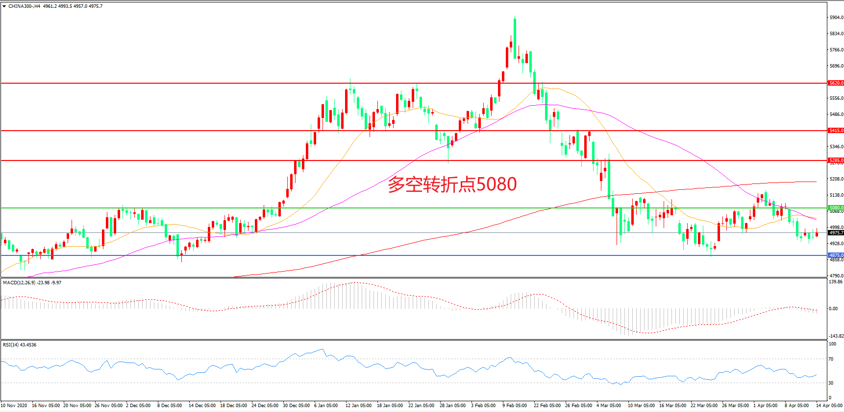 4小时图看,沪深300延续低位震荡,整体表现相对低迷,均线系统粘合成为上方阻力,4875成为下方支撑,MACD绿柱增加,RSI指标走平,日内延续震荡概率较大。