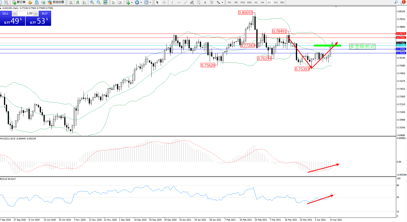 澳元兑美元强势拉升至0.77491附近震荡,油价是触发澳元兑美元上涨的因素,来自澳大利亚的经济数据也支持澳元,4月西太平洋银行消费者信心指数自前值2.6%升至6.2%。澳大利亚周四将公布4月消费者通胀预期(前值4.1%)和3月就业数据,须密切留意。如果数据继续表现抢眼,将会向澳元上升提供更强的基础。全球地缘负面消息对澳洲贸易环境前景造成了更大冲击,抵消了澳大利亚就业数据向好的带动。