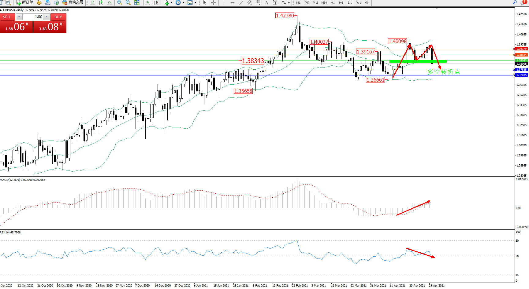 交易策略:1.38343下方看跌,目标1.37525、1.37035