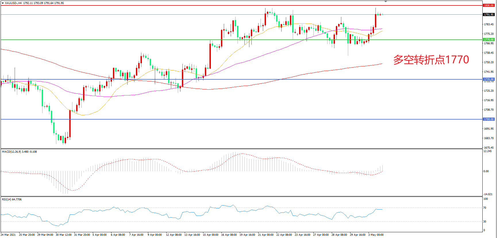 周一(5月3日),美国财长耶伦为总统拜登的4万亿美元基建与家庭计划刺激通胀率上升的忧虑辩护,但ISM制造业指数在供应链受干扰和原材料短缺持续的形势下表现不佳,数据公布后,10年前美债收益率下破1.6%,美指下破91关口,现货黄金大幅反弹,收报1791.84美元/盎司。