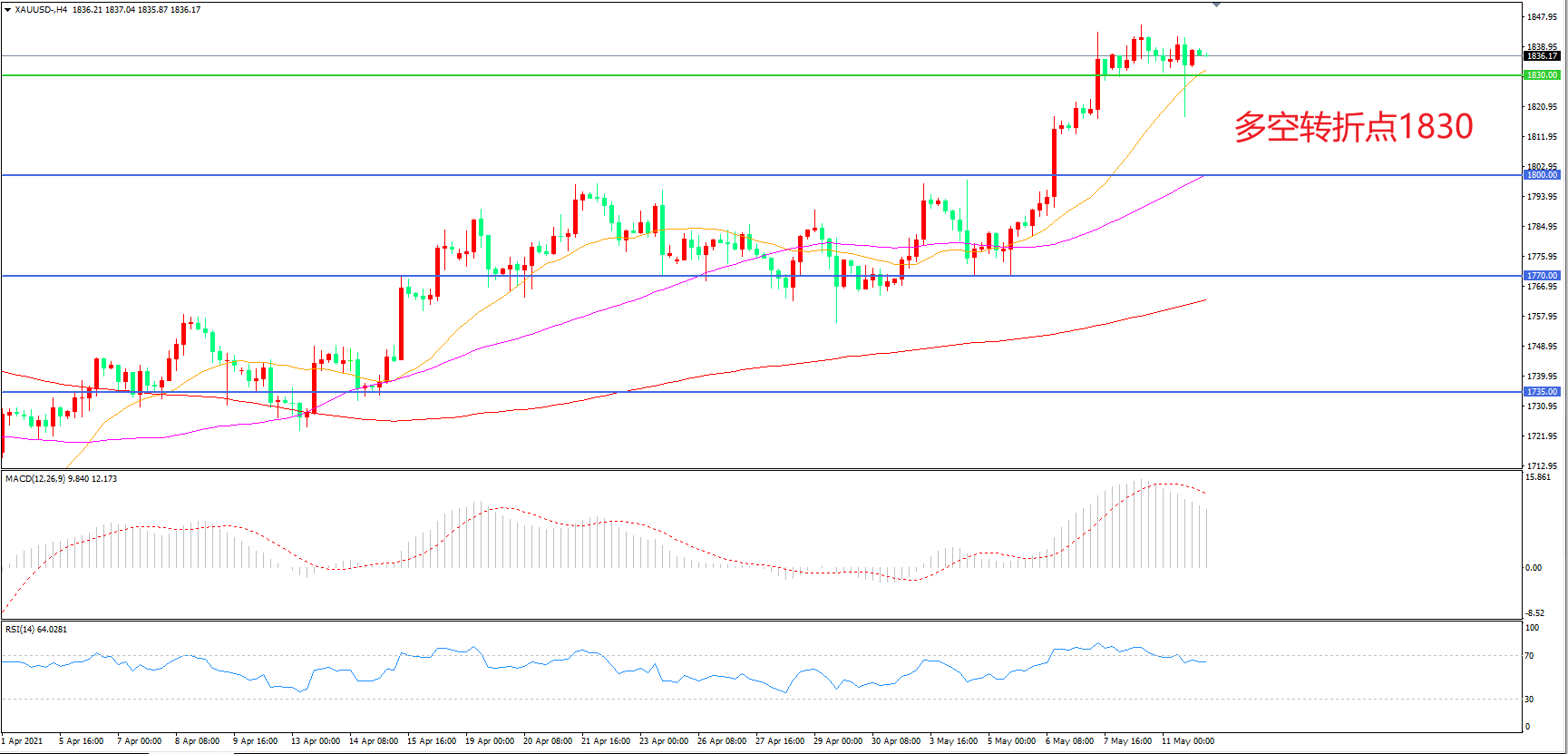 周二(5月11日),美元延续低迷走势,自2月25日以来首次跌破90关口,现货黄金则高位盘整,长针探底后收报1836.55美元/盎司。目前市场的目光都聚焦于即将公布的美国4月CPI,以判断美联储是否将开始改变其通胀立场。若通胀数据大幅攀升,可能会导致美联储收紧货币政策的时程早于预期。