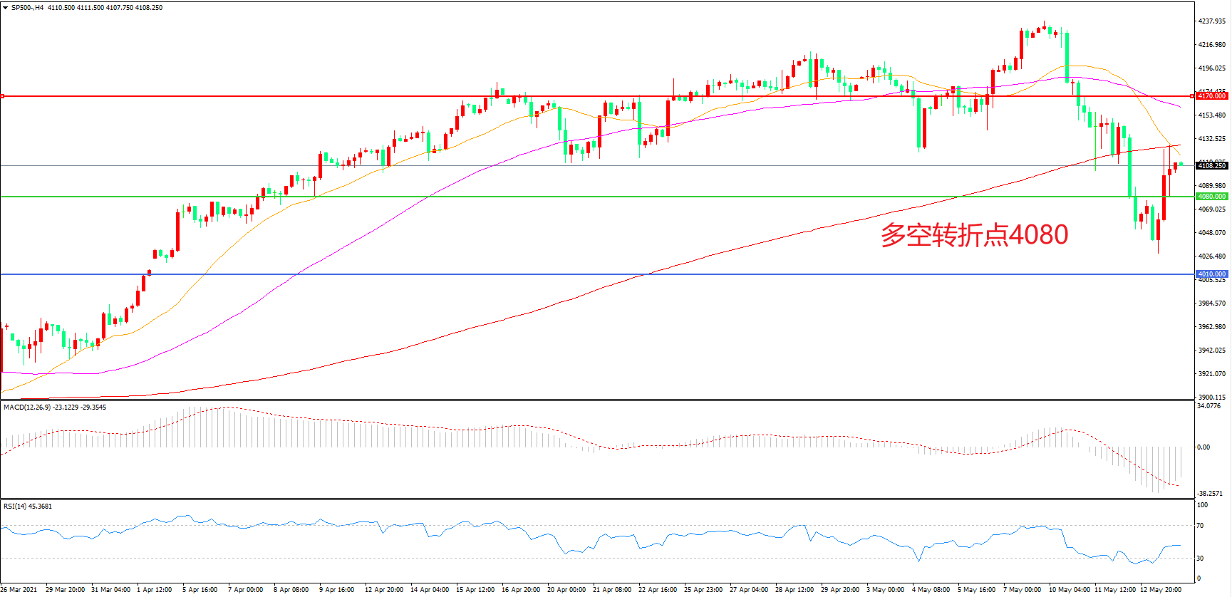 4小时图看,标普500探底回升,低位阳线连续拉升,短期走势有所回暖,均线系统有所回升,4170成为多空分水岭,MACD绿柱缩短,RSI指标走平,日内震荡上行概率较大。
