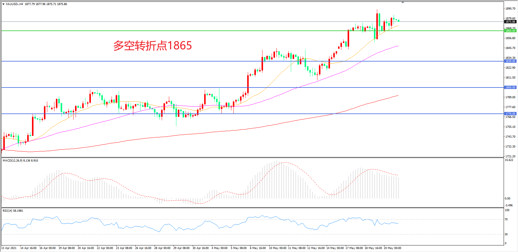 周四(5月20日),美国加强税务监管的消息传出后,加密货币市场崩跌,资金流入金市,美联储纪要鸽派程度不及预期,给金价沉重的压力,现货黄金延续高位震荡,收报1876.56美元/盎司。短期来看,美元指数再度走软,美债收益率小幅回落,均回吐周三美联储公布首次明确提到要讨论退出QE的会议纪要后的涨幅,随着投资者对冲通货膨胀的需求增加,金价有望再度收到青睐。
